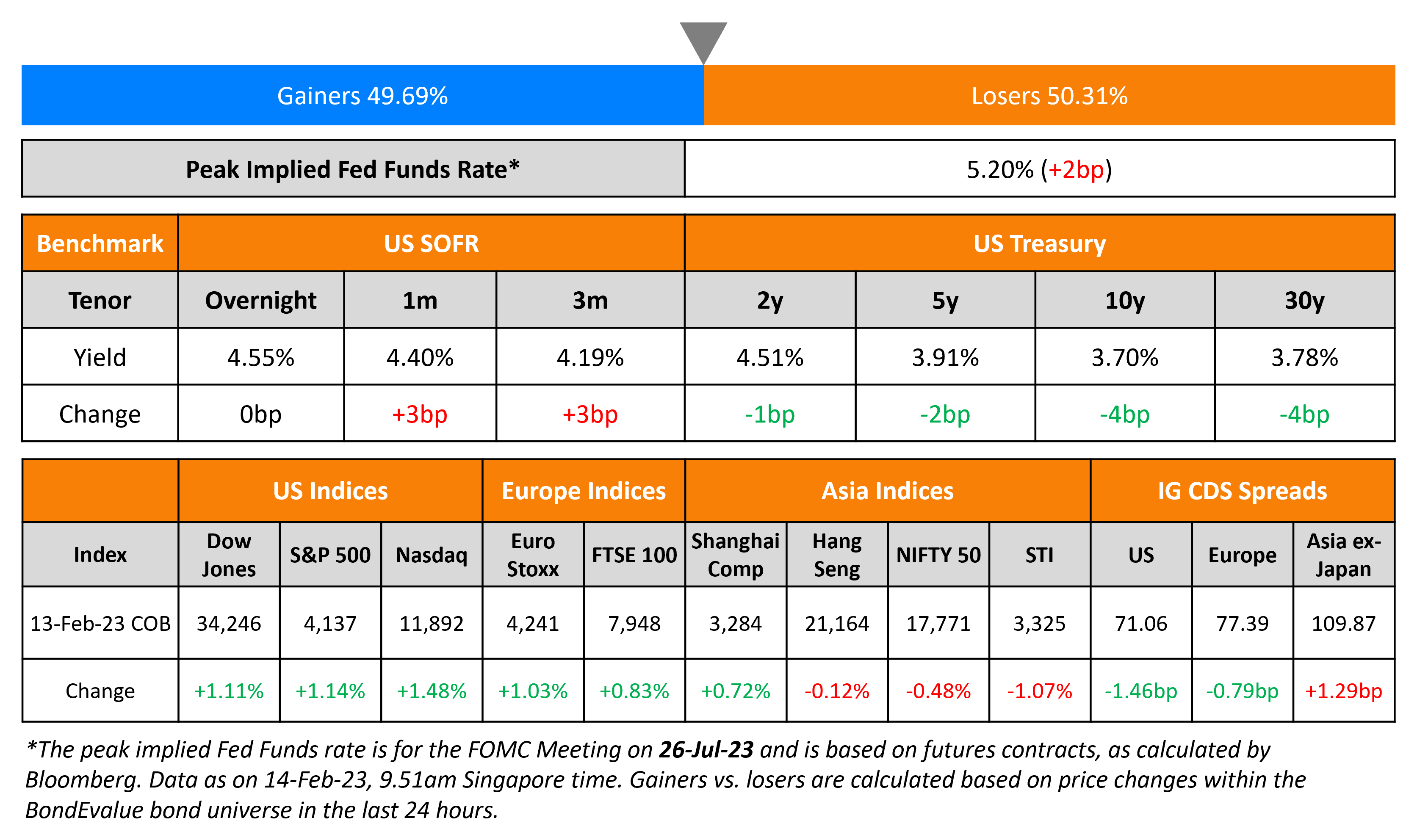 US Treasury yields were marginally lower by 2-4bp across the curve. The peak Fed funds rate widened 2bp to 5.20% for the July 2023 meeting. All eyes now focus on the Jan CPI inflation report, out later today, with estimates of a 6.2% print. Markets are currently pricing in a 91% probability of a 25bp hike at the March meeting and a 73% probability of another 25bp hike in May. US IG CDS spreads tightened by 1.5bp while HY spreads were 10.3bp tighter. Equity indices were higher with the S&P and Nasdaq higher by 1.1% and 1.5% respectively.
