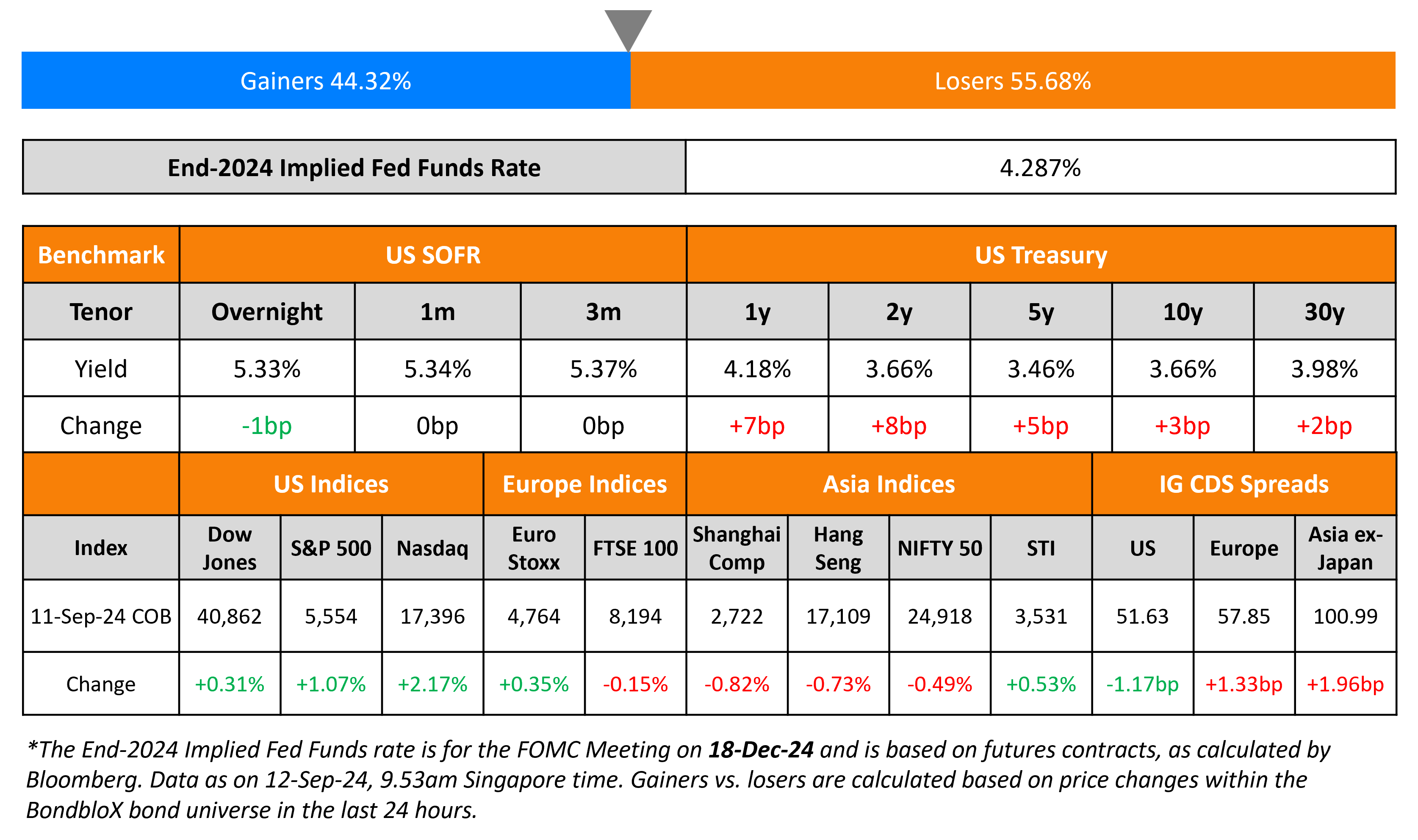 The Treasury yield curve bear flattened with the 2Y yield up by 8bp, while the 10Y yield rose 3bp. US CPI rose as expected, by 2.5% YoY in August vs. 2.9% in July. Core CPI held steady and was in-line with expectations at 3.2%. Separately, the US Treasury’s 10Y auction saw strong demand with a bid-to-cover of 2.64x (vs. 2.32x last month) and an indirect acceptance rate of 76% (vs. 66.2% last month). Following the data release, markets are now pricing-in a 25bp rate cut by the Fed next week. Overall, markets are still pricing-in 100bp of cuts by end-2024. US IG CDS spreads tightened by 1.2bp and HY CDS spreads were tighter by 6bp. Looking at US equity indices, the S&P and Nasdaq were both higher by 1.1% and 2.2% respectively.