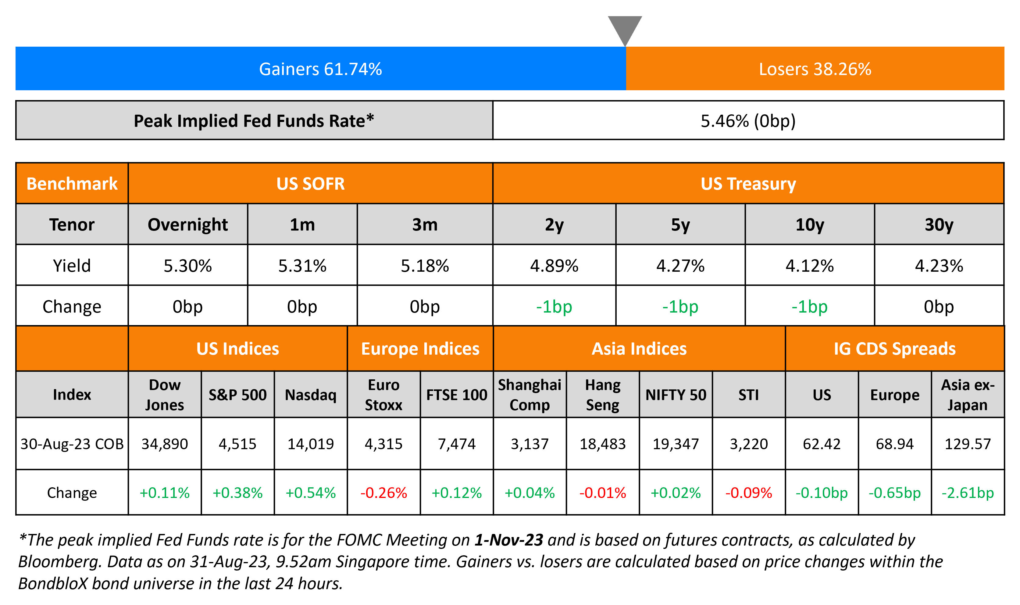 US Treasury yields were flat on Wednesday. US ADP employment data showed a 177k increase in private payrolls, below the 371k last month and estimates of 195k. For Q2, the second revision of US GDP came at 2.1%, lower than the preliminary 2.4% reading. CME probabilities for a 25bp rate hike at the November meeting remain relatively unchanged at 42%. US IG credit spreads were tighter by 0.1bp while HY CDS spreads tightened 2.1bp. The S&P and Nasdaq were higher by 0.4-0.5%.