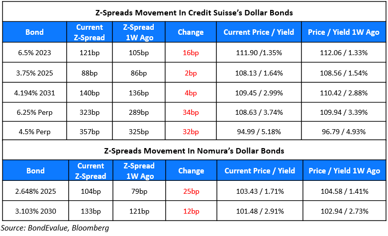 Credit Suisse’s stock is down 13% while Nomura’s stock is down 17% since Friday. Both companies’ bonds have fallen with Credit Suisse’s USD 4.5% Perp down 2.4 cents to 95 cents on the dollar since Friday while Z-Spreads of their Perps have widened over 30bps as seen in the table below. Similarly, Nomura’s USD 2.648% 2025s are down over 1.1 cents to 103.4 cents on the dollar with its Z-spread 25bp wider.