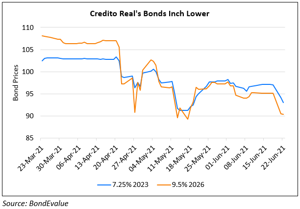 Credito Real’s dollar bonds fell 3-4% on Monday and are lower today. This comes after its downgrade by Fitch last week to BB from BB+ citing heightened pressures on capitalization, lower earnings generation and deteriorated asset quality metrics. The company’s bonds were hammered in the last couple of months after they adjusted their 2020 annual statements where they revised non-performing loans by 82%.