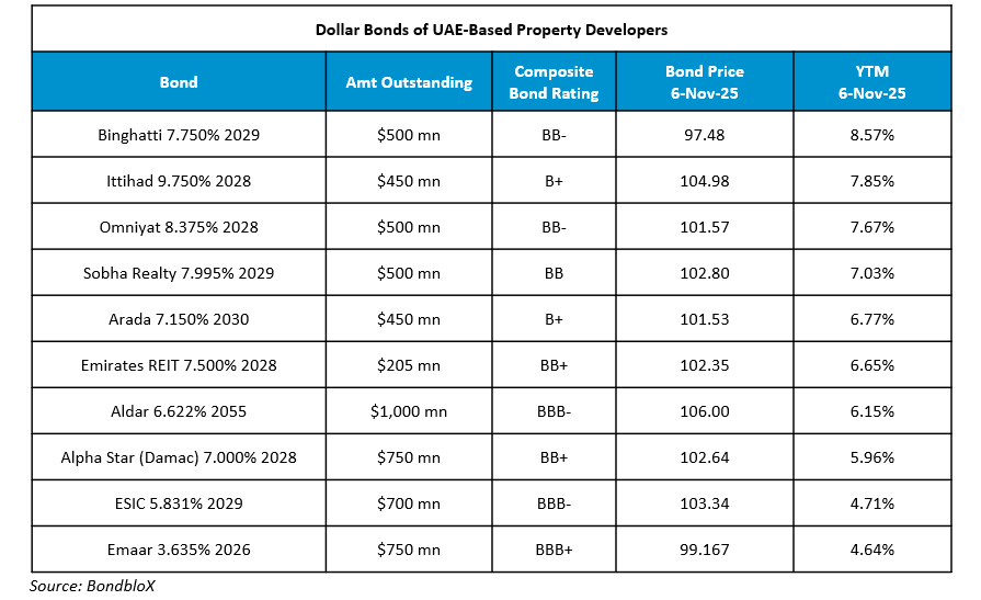 Damac Real Estate Development (Alpha Star) and its senior unsecured sukuk were upgraded by a notch to BB+ from BB by S&P. The upgrade reflects the developer’s strong revenue visibility, robust presales, and improved financial profile amid Dubai’s buoyant residential real estate market. The upgrade also reflects Damac’s conservative financial policy, strong liquidity (with about $6.7bn in cash as of end-September), along with its solid brand and market position. As of end-September, Damac’s revenue backlog rose 11% YoY to $20bn, with 70–80% of projects already presold, ensuring high visibility of earnings over the next two to three years. The company, Dubai’s second-largest developer after Emaar, has achieved $6bn in sales YTD, with over 54,000 units in its pipeline. Revenue is projected to rise to $4.0–4.3bn in 2025 and to $5.0–5.3bn in 2026, up from $3.3bn in 2024, supported by steady handovers and robust demand. S&P expects operating cash flow of $2.0–2.7bn annually in 2025–2026, despite continued land acquisitions and dividend payouts. EBITDA is forecast to grow to $1.2–1.3bn in 2025 and $1.6–1.7bn in 2026, with debt-to-EBITDA improving modestly to 1.2x–1.6x. However, financial headroom remains limited, they noted, given the likelihood of refinancing a $400mn sukuk due 2026 and rising dividends. Its dollar bonds traded stable with its 7% 2028s at 102.64, yielding 5.96%.