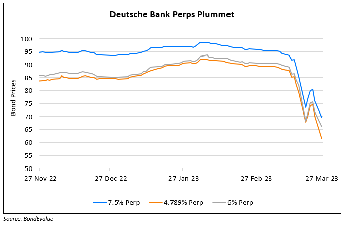 Deutsche Bank’s AT1s tumbled by over 5-8 points after its credit default swaps (CDS) jumped by 60bp since Thursday to over 203bp. This comes in the wake of spillover risks following Credit Suisse’s downfall and subsequent rescue by UBS. Deutsche Bank had for a decade been considered among the weaker European big banks, ever since its capital and liquidity position were under question besides legal fines amounting to over €12bn. However, currently its CET1 ratio stands at 13.4% (as of end-2022), higher than its minimum threshold of 10.55% set by the ECB. Besides, Deutsche Bank has reported 10 straight quarters of profit after a large organizational restructuring that began in 2019. German Chancellor Olaf Scholz said on Friday that the bank has “thoroughly reorganized and modernized its business model and is a very profitable bank”. The broad spillover risks impacted AT1s of other European banks too, including the likes of Barclays, SocGen, Commerzbank that fell by over 5%.