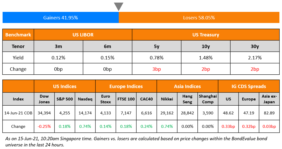 S&P closed higher by 0.2% while Nasdaq moved up 0.7% to continue making new highs. Tech once again traded higher, up 1% while Materials and Financials (down 1.3% and 1%) weighed down on the indices. Apple was up 2.5%, Facebook 1.7%, Amazon 1.1% and Alphabet and Microsoft were up 0.8% each. A Survey of Consumer Expectations for May by the Fed revealed that the inflation rate is expected to be 4% one year from now and 3.6% three years from now. All eyes are now set on the FOMC meeting tomorrow. US 10Y Treasury yields climbed 2bp from three month lows to 1.48%. European markets were largely flat with DAX down 0.1% and CAC and FTSE up 0.2%. Spreads widened across – US IG and HY CDS widened 0.33bp and 1.22bp respectively. US HY bond yields fell to a new record low of 3.84% as as tracked on the Bloomberg Barclays HY index. Bloomberg reports that the backdrop of an earnings recovery and strong returns of energy companies have helped demand for higher yielding assets.