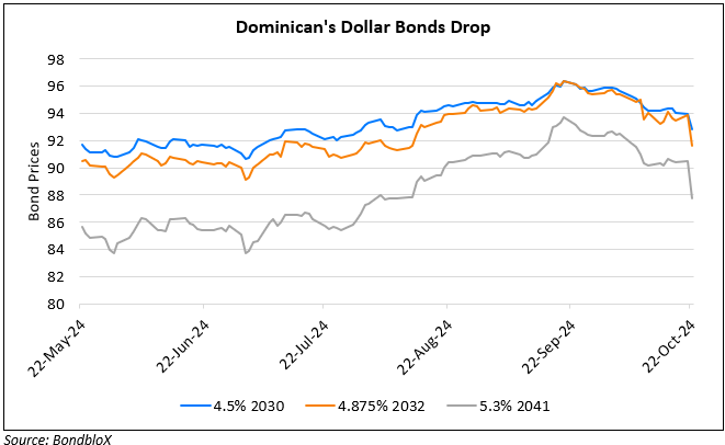 Dominican Republic’s dollar bonds fell by over 3 points across the curve after its President Luis Abinader, withdrew a tax bill that was aimed at increasing collections. Despite having a majority in the Congress, he was unable to gather sufficient support to pass the bill. Bloomberg notes that the tax collection bill was considered necessary to raise Dominican’s existing low levels of tax collection and also tackle its rising debt burden. Estimates suggested that it would have likely boosted revenues by 1.5% of GDP. Analysts note that the bill might have been essential to the sovereign’s hopes of being upgraded to investment grade by the major rating agencies. Moody’s and Fitch both rate Dominican Republic at Ba3 and BB- respectively, three notches below IG-status. S&P rates it slightly higher at BB.