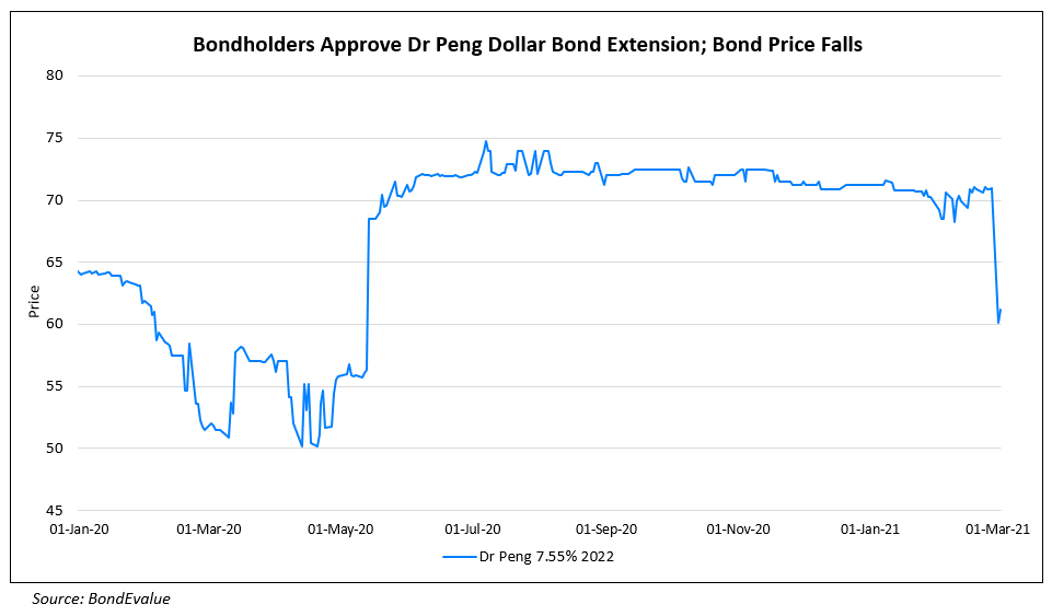 China’s Dr. Peng Telecom & Media Group announced on Monday that it has received approval from bondholders of its $257.6mn 7.55% bonds due in December this year to extend the maturity. Holders representing 87.3% of the total amount outstanding voted at the meeting, of which 99.85% agreed to the proposal, which includes a default waiver and a maturity extension from December 1, 2021 to December 1, 2022. As per the terms of the extension, Dr. Peng will redeem 5% in principal on June 1, 2021 and 20% on December 1, 2021. As per IFR, the company will “also add security over an inter-company loan made to its subsidiary, Pacific Light Data Communications, which owns four of the six pairs of ultra high-capacity optical fibres in the Pacific Light Cable Network, an undersea fibre optic cable project that aims to connect Hong Kong and Los Angeles.” Bondholders that gave consent will receive a consent fee of $15 for every $1,000 in principal. This is the second extension of its dollar bonds, which originally had a maturity date of June 1, 2020. The first extension was by 18 months from the original maturity in exchange for a coupon increase to 7.55% from 5.05% and partial principal repayments on June 1 and October 1 last year.