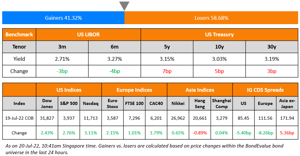 US equity markets ended with strong gains on Tuesday with the S&P and Nasdaq up 2.8% and 3.1% respectively as risk aversion receded. Sectoral gains were led by Communication Services and Industrials up 3.6% each. US 10Y Treasury yields were 5bp up at 3.03%. European markets were also higher with the DAX, CAC and FTSE up 2.7%, 1.8% and 1% respectively. Brazil’s Bovespa inched higher by 1.4%. In the Middle East, UAE’s ADX and Saudi TASI were up 0.5% and 1.8%. Following the US, Asian markets have also opened stronger – Shanghai, HSI, Nikkei and STI were up 0.7%, 1.9%, 2.4% and 1.3% respectively. CDS markets also saw relief from the improvement in risk sentiment. US IG CDS spreads narrowed 5.4bp and US HY spreads were tighter by 31.5bp. EU Main CDS spreads were 8.2bp tighter and Crossover spreads were tighter by 39.5bp. Asia ex-Japan IG CDS spreads widened 5.4bp.