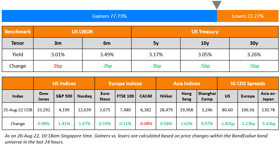 US equity markets continued to extend their gains on Thursday with the S&P and Nasdaq closing higher by 1.4% and 1.7% respectively. Sectoral gains were led by Materials, up 2.3% and Communication Services rising 2%. US 10Y Treasury yields were 5bp lower at 3.05%, ahead of Powell’s speech on Friday at Jackson Hole. European markets were mixed – DAX and FTSE rose 0.4% and 0.1% respectively while CAC ended 0.1% lower. Brazil’s Bovespa was up 0.6%. In the Middle East, UAE’s ADX and Saudi TASI ended up 0.2% and 1.2% respectively. Asian markets have opened higher today – Shanghai, HSI, Nikkei and STI were up 0.2%, 0.6%, 0.9% and 0.4% respectively. US IG CDS spreads tightened 1.8bp and US HY spreads were tighter by 12.4bp. EU Main CDS spreads were 2.2bp narrower and Crossover spreads tightened by 13.5bp. Asia ex-Japan IG CDS spreads tightened 5.4bp.