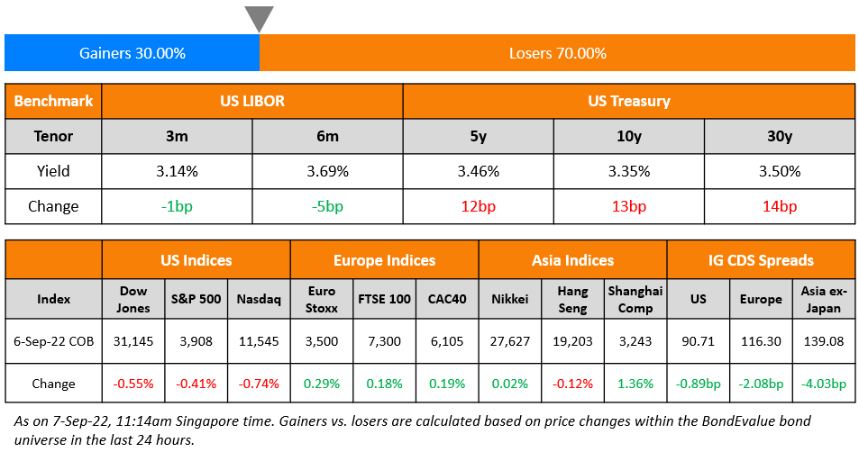 US 10Y Treasury yields were 10bp higher at 3.35% and the 30Y yield was up 11 bps to 3.5%, its highest level since July 2014. This move led to long-tenor/high duration bonds falling the most. Besides, the 2Y Treasury yield was also up 10bp after strong ISM Non-Manufacturing data that rose to 56.9 in August vs. expectations of a decrease to 54.9 post July’s 56.7 reading. This indicated a second consecutive month where the US service industry picked-up. The positive data print led to an increase in the probability of a 75bp September Fed rate hike to 70% from 57%. This in turn led to a spike in 2Y yields.
