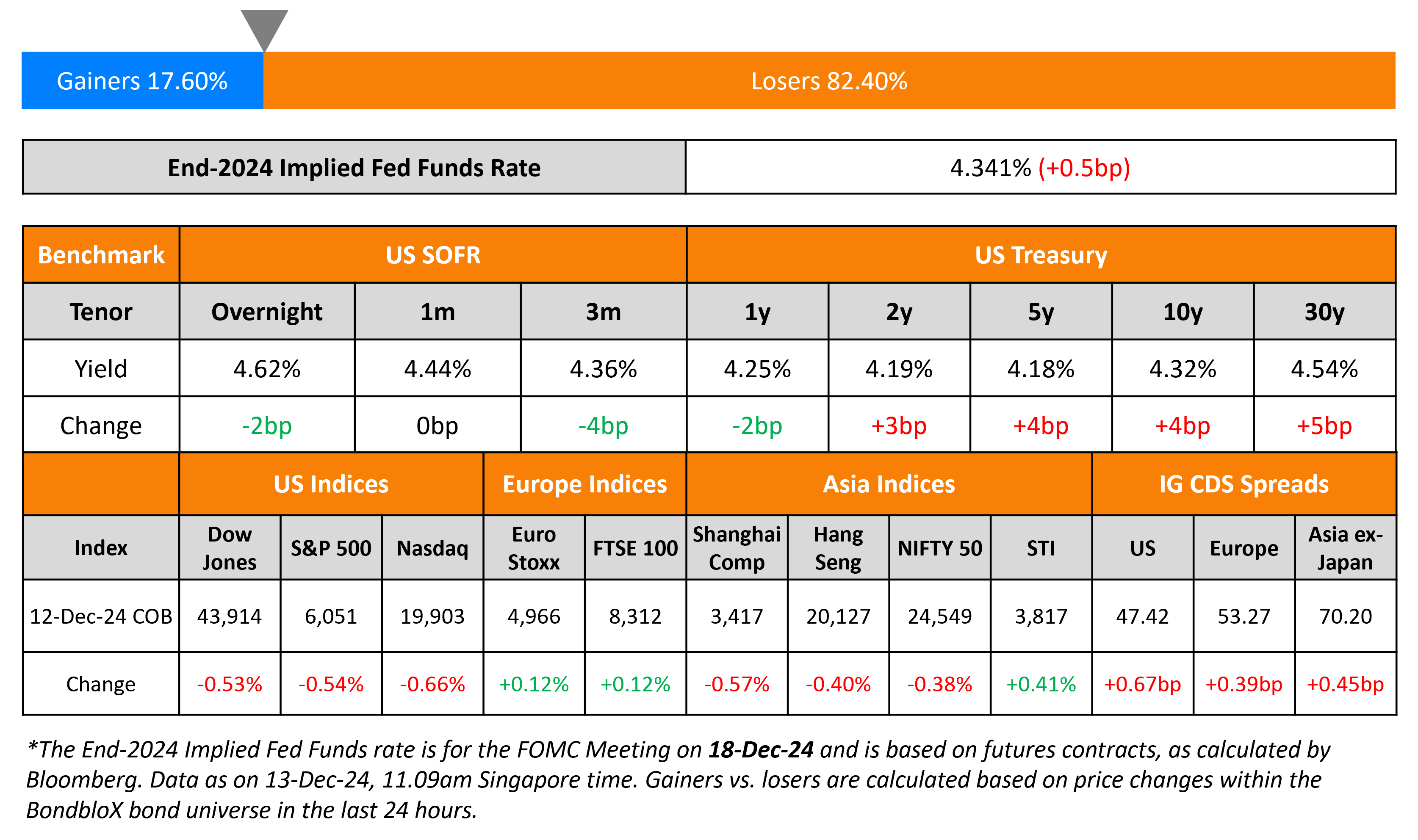 US Treasury yields rose by 3-5bp across the curve. US PPI rose by 3% YoY in November, higher than expectations and the revised prior month’s reading of 2.6%. Initial jobless claims for the previous week rose rose to a two-month high, rising by 242k, worse than expectations of 220k.