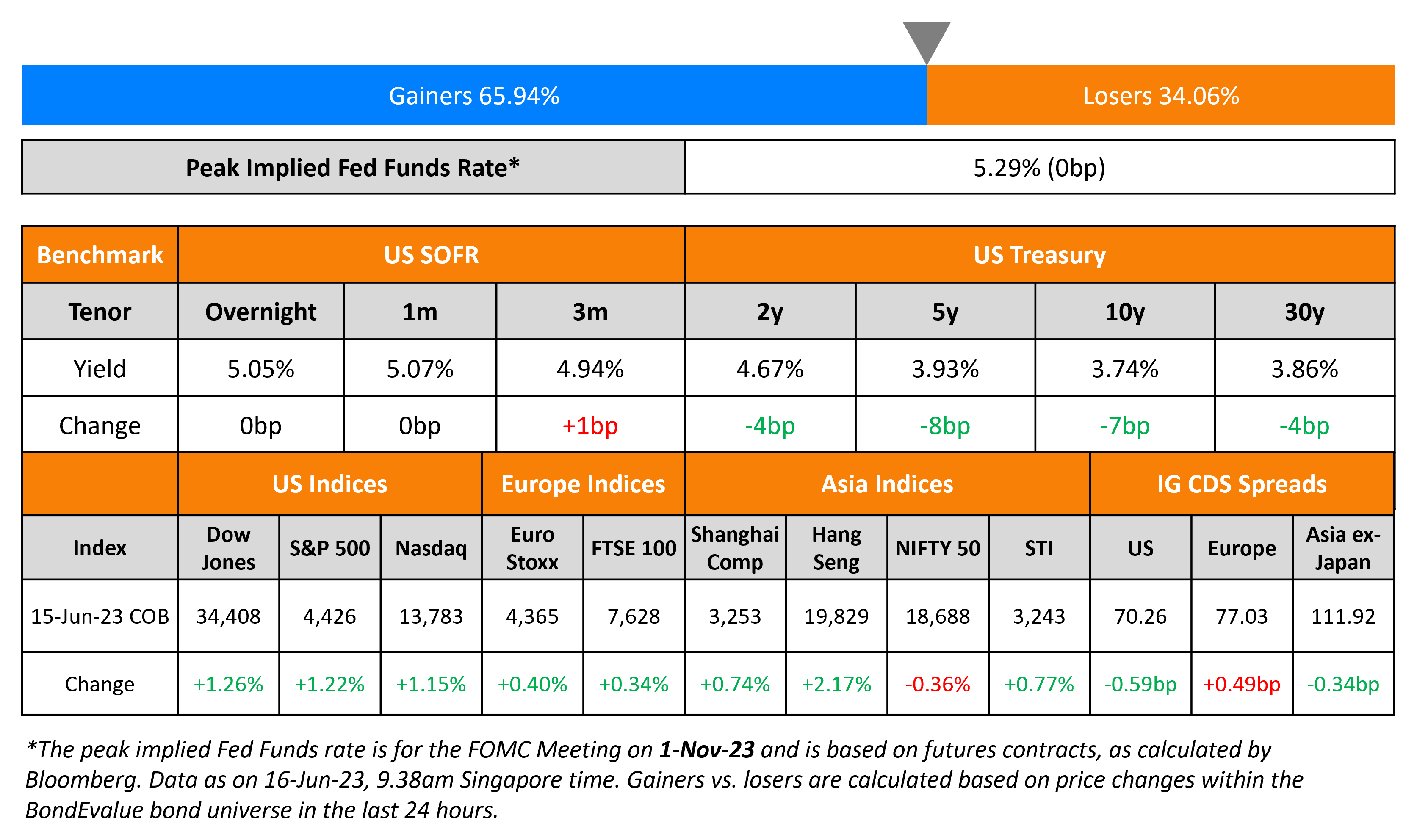 US Treasury yields inched lower across the curve yesterday with economic data being broadly mixed. Headline and core US retail sales advanced 0.3% and 0.4%, beating expectations of -0.2% and 0.2%, indicating consumer resilience. The NY Empire Manufacturing Index print came at 6.6 in June, in contrast to an expectations of a -15.1 print. On the other hand, initial jobless claims for the prior week rose 1k to 262k, well above the 249k forecast. Philadelphia Fed Business Outlook came at -13.7, roughly in-line with the -14 expected print. Market participants continue to expect the Fed to hike rates by 25bp in July with a 72% probability. The peak Fed Funds rate was unchanged at 5.29% for November. Equity indices ended higher with the S&P and Nasdaq up by ~1.2%. US IG and HY CDS spreads tightened 0.6bp and 3.8bp respectively.