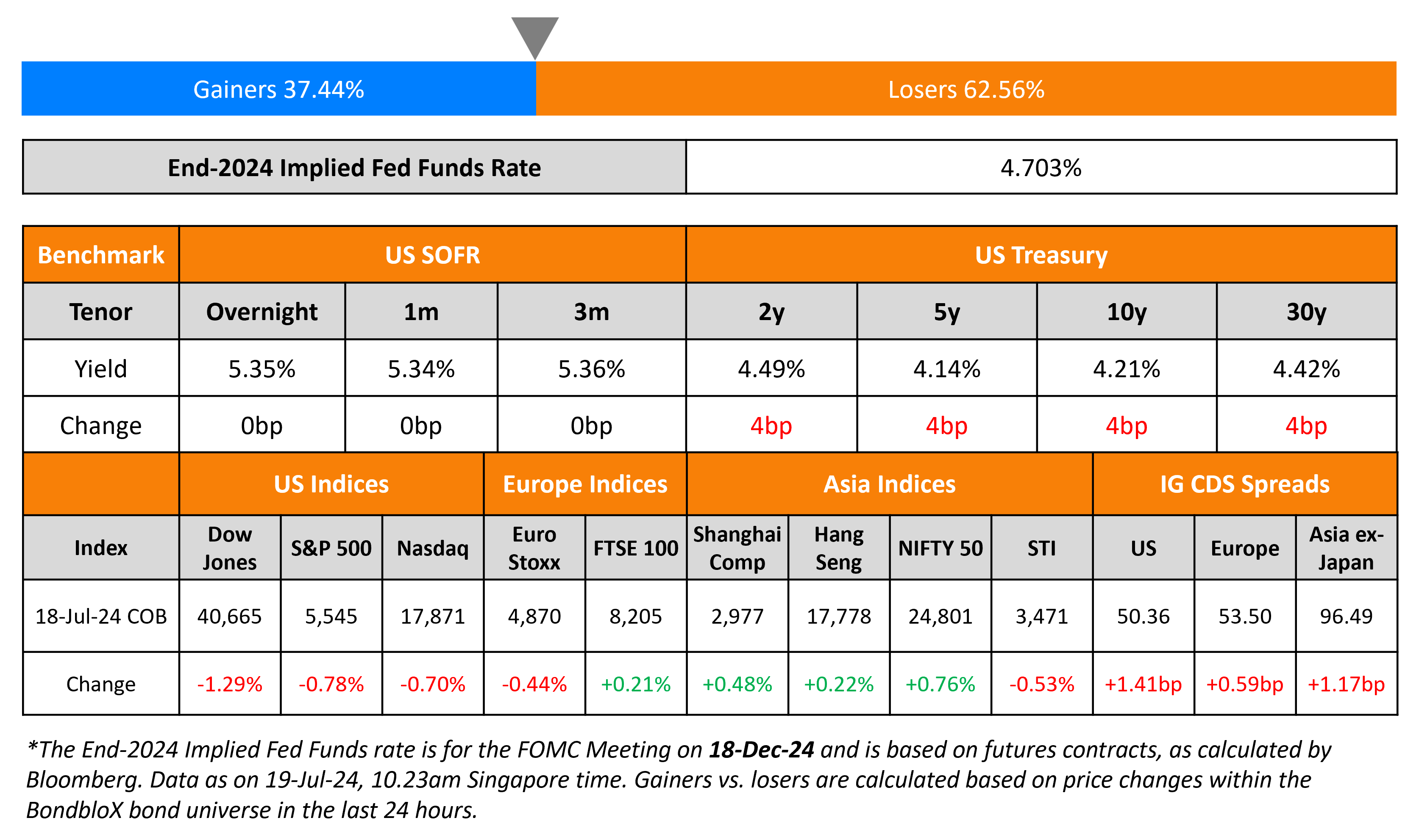 The US Treasury curve saw a parallel shift higher in yields, by 4bp across the curve on Thursday. Chicago Fed President Austan Goolsbee said that the Fed may need to lower rates soon in order to avoid a sharper deterioration in the labor market. He added that multiple months of improving data have reassured him that they are on track to bring inflation down to their 2% goal. Equity indices continued to move lower, with the S&P and Nasdaq falling 0.7-0.8%. US IG spreads were 1.4bp wider and HY CDS spreads were wider by 6.2bp.