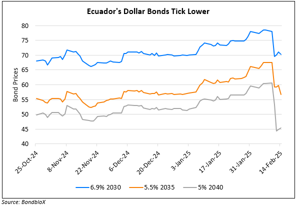Ecuador’s dollar bonds fell by over 2 points, continuing their trend lower since the outcome of the election vote. The bond slump intensified after the current President Daniel Noboa replaced his finance minister. With less than 25,000 votes separating the two candidates, analysts expect volatility ahead of the April runoff. The rise of his challenger Luisa González, has seen some bondholders raise concerns about Ecuador’s ability to meet its financial obligations. This includes a $1.5bn funding gap and a looming bond amortization schedule.