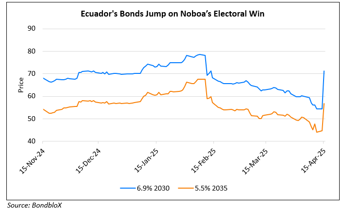 Ecuador’s sovereign dollar bonds surged higher after President Daniel Noboa was declared the winner of Sunday’s election, securing a full four-year term. Despite opposition candidate Luisa González refusing to concede and demanding a recount, Noboa’s wide lead of 55.7% to 44.4% with nearly 97% of votes counted, has been recognized by several foreign governments and key officials in González’s own party. Noboa now faces the urgent task of tackling rampant crime rates that have risen over the past five years. The rally in Ecuador’s dollar bonds reflects investor optimism with Noboa’s victory being seen as a mandate to push economic reforms, especially in mining and oil. Earlier, Ecuador’s dollar bonds were among the worst performers across developing nations this year, with yields soaring to almost 35% after González did much better than polls had forecast in the first round of elections.