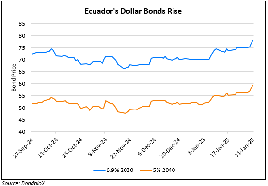 Ecuador’s dollar bonds rallied by 1.5 points across the curve after markets warmed to the possibility of the current President, Daniel Noboa winning a second term. Noboa is considered market-friendly, and polls suggest a widening lead for him ahead of the election on February 9. Having occupied office in late-2023, Noboa pushed to address Ecuador’s fiscal and security crises, whilst also implementing austerity measures like raising taxes and cutting some government subsidies (including fossil fuels). Besides, he also helped obtain a $4bn deal with the IMF.