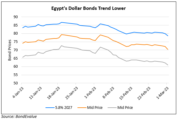 Egypt’s dollar bonds fell by over 3% across the curve. Bloomberg reports that the cost of insuring Egypt’s debt against default using CDS rose from 879bp to 1,052bp, the highest this year. Egypt’s dollar bonds had been steadily declining over the course of February ever since it was downgraded to B3 from B2 by Moody’s. Due to a $3bn loan package secured from the IMF and pledges of financial support from Gulf Arab allies, Egypt’s bonds had rallied from November until January. However, with neither of the above offering a quick solution anytime soon, Egypt has faced pressures. Kaan Nazli, senior economist and money manager at Neuberger Berman Asset Management said, “Egyptian bonds are a popular overweight for emerging- market sovereign credit investors and tend to trade in line with risk sentiment”. Gulf allies including Saudi Arabia and Qatar have earmarked more than $10bn for the country. As per Bloomberg, Gulf funding is considered “critical” for Egypt to bridge a funding gap of ~$17bn. Over the course of the last one year, Saudi Arabia, Qatar and UAE have deposited $13bn with the Egyptian central bank.