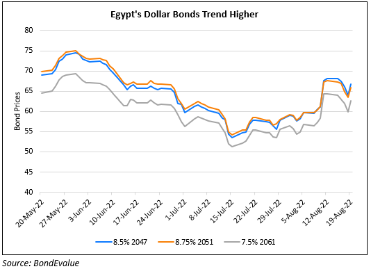 Longer-dated dollar bonds of Egypt rose by over 4% yesterday, just a day after their central bank governor Tarek Amer resigned. He resigned one-day prior to Egypt’s interest rate setting meeting where most economists expected the third rate hike of 2022 to combat inflation. However, the central bank decided to keep overnight rates unchanged, just hours after President Abdel Fattah al-Sisi appointed Hassan Abdalla as its interim governor. Annual inflation hit 13.6% in July, its highest in over three years.
