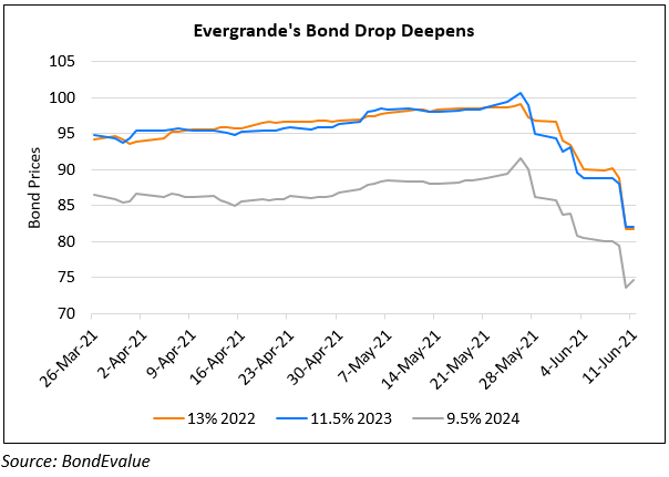 China Evergrande’s dollar bonds slipped 5-8% on Thursday as concerns grow over its financial position taking the total drop to more than 15% since the beginning of this month. Evergrande is the world’s most indebted property developer with $305bn in liabilities including over $20bn in outstanding dollar bonds. Evergrande’s bonds have been under pressure in recent weeks after Caixin’s WeNews reported that the regulator CBIRC was investigating over CNY 100bn ($15.7bn) of transactions between the company and Shengjing Bank Co. More recently, sources said that regulators asked banking creditors to perform stress tests with regard to their Evergrande exposure. Earlier this week, Evergrande confirmed that its business with Shengjing was in line with laws and denied that regulators had asked banks to perform stress tests. They added that they were planning to meet at least one of the three red-lines metrics by June after breaching all of them last year. Despite all the efforts of the company, investor confidence has dwindled as this is the third high profile name witnessing pressure after China Fortune Land Development and China Huarong.