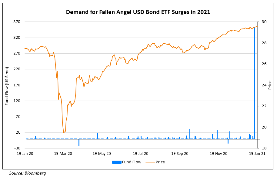 Strong appetite for fallen angel bonds – bonds of issuers that have recently been downgraded to junk from investment grade – have led to solid inflows in the iShares FALN ETF in the new year. Record weekly inflows of $478mn, followed by another $93mn have boosted FALN’s total assets to over $1bn now. Strong demand on the back of stimulus from the Fed led the ETF to rise 7.75% in 2020 in price terms ex-coupon and a massive 41.6% since late March last year when fears regarding the pandemic led to a sharp sell-off. FALN’s single largest bond holding (2.21%), Carnival’s 11.5% bond due 2023 has rallied over 15% since issuance at 99 in early April 2020 to now trade at 114. Sameer Samana, senior global market strategist at Wells Fargo Investment Institute said, “The whole script flipped in early November. Investors are betting that a re-opening of the global economy, along with the reflationary trends that we’re seeing, will lead to spread tightening and credit rating upgrades.”