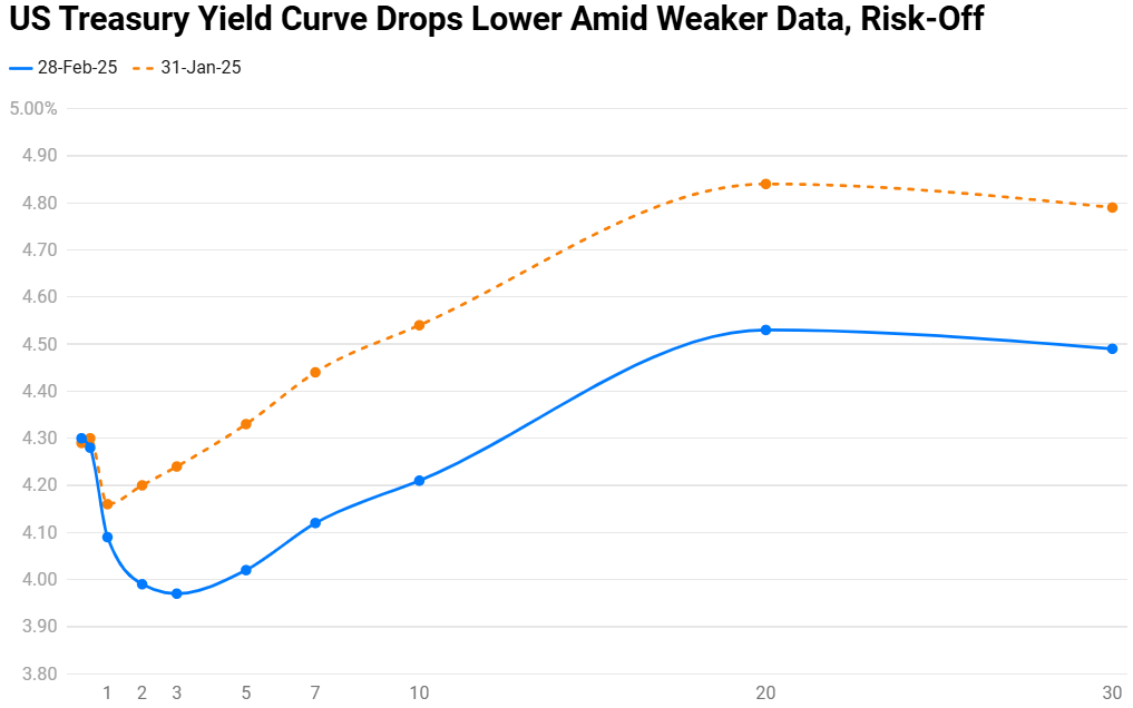 February 2025 was yet another positive month for bond investors with 89% of dollar bonds ending higher (price returns ex-coupons). Both, Investment Grade (IG) bonds and High Yield dollar bonds performed well, with IG outperforming. About 94% of IG dollar bonds and 75% of HY dollar bonds ended in the green. This came on the back of weaker economic data through the latter half of the month, followed by the broad risk-off move that saw Treasury yields decline across the curve. Markets are currently pricing-in a 25bp rate cut by the Fed in June and a second rate cut in September.