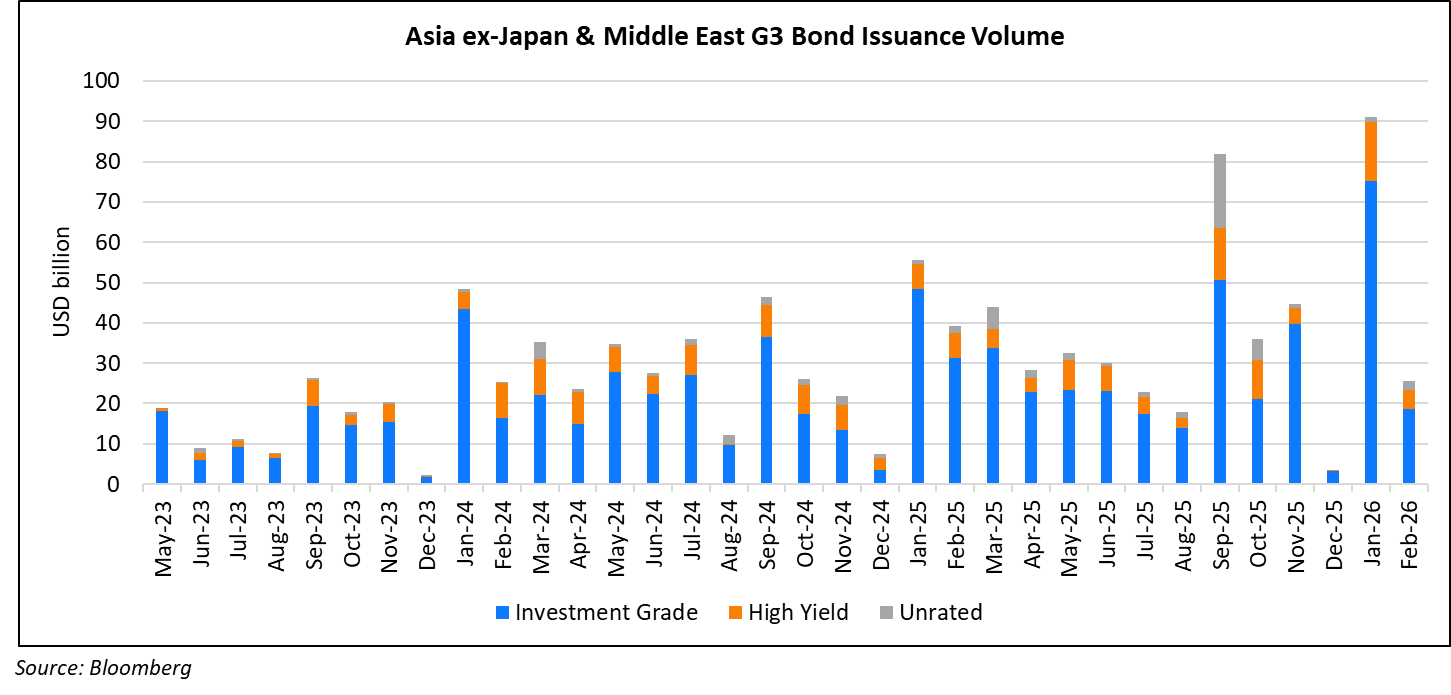 Asia ex-Japan & Middle East G3 issuance stood at $25.5bn, down 72% MoM and 35% YoY. 73% of the volumes came from IG issuers with HY issuing 19% and unrated issuers taking the rest.