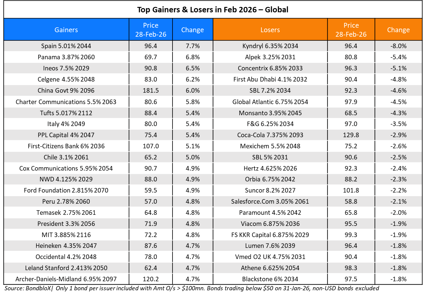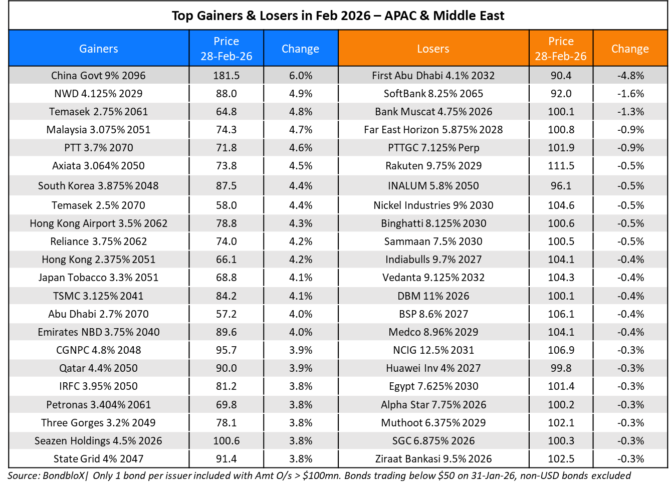 Frontera Energy’s dollar bond was the top gainer in the high-yield (HY) category, rising 31% over the last month. The move came after GeoPark signed a deal to buy Frontera’s oil and gas assets in Colombia for up to $400mn plus assumed debt. Tullow Oil’s bond was the second best performer, gaining 15% after the company reached a refinancing agreement supported by about two-thirds of its bondholders and lender Glencore Energy UK Ltd. to delay the principal repayment on the bond. NWD’s Perps were also among the top gainers, surging 8–14% after the developer announced the launch of three new residential projects in 1H2026. Bonds of other Hong Kong-based developers, like Lai Sun and Far East also rallied by 10% during the month. Ineos bonds gained 5–11% last month after the EU crack down on cheap imports by foreign companies. Senegal’s dollar bonds also rallied by 6-8% after the country secured funding to meet eurobond payments due in March. MetInvest’s dollar bonds gined by 7-13% after it launched Investor roadshows to gauge appetite for a new bond issuance.