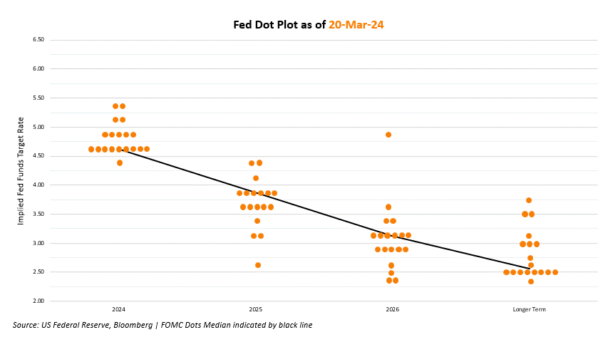 The US Treasury yield curve bull steepened with the 2Y and 5Y yields down 10bp and 7bp respectively while the 10Y yield was down 3bp. The Fed kept its policy Fed Funds Range unchanged at 5.25-5.5% as expected, for a fifth straight meeting. Policymakers maintained their outlook for 75bp in rate cuts for 2024. However, even as the median dots for rate cuts remained unchanged, more members now anticipate fewer rate cuts than December’s dot plot projections. Policymakers also moved toward slowing the pace of reducing bond holdings, suggesting they aren’t alarmed by a recent uptick in inflation. While Jerome Powell continued to highlight that officials would like to see more evidence that prices are coming down, he also said it will be appropriate to start easing “at some point this year”.