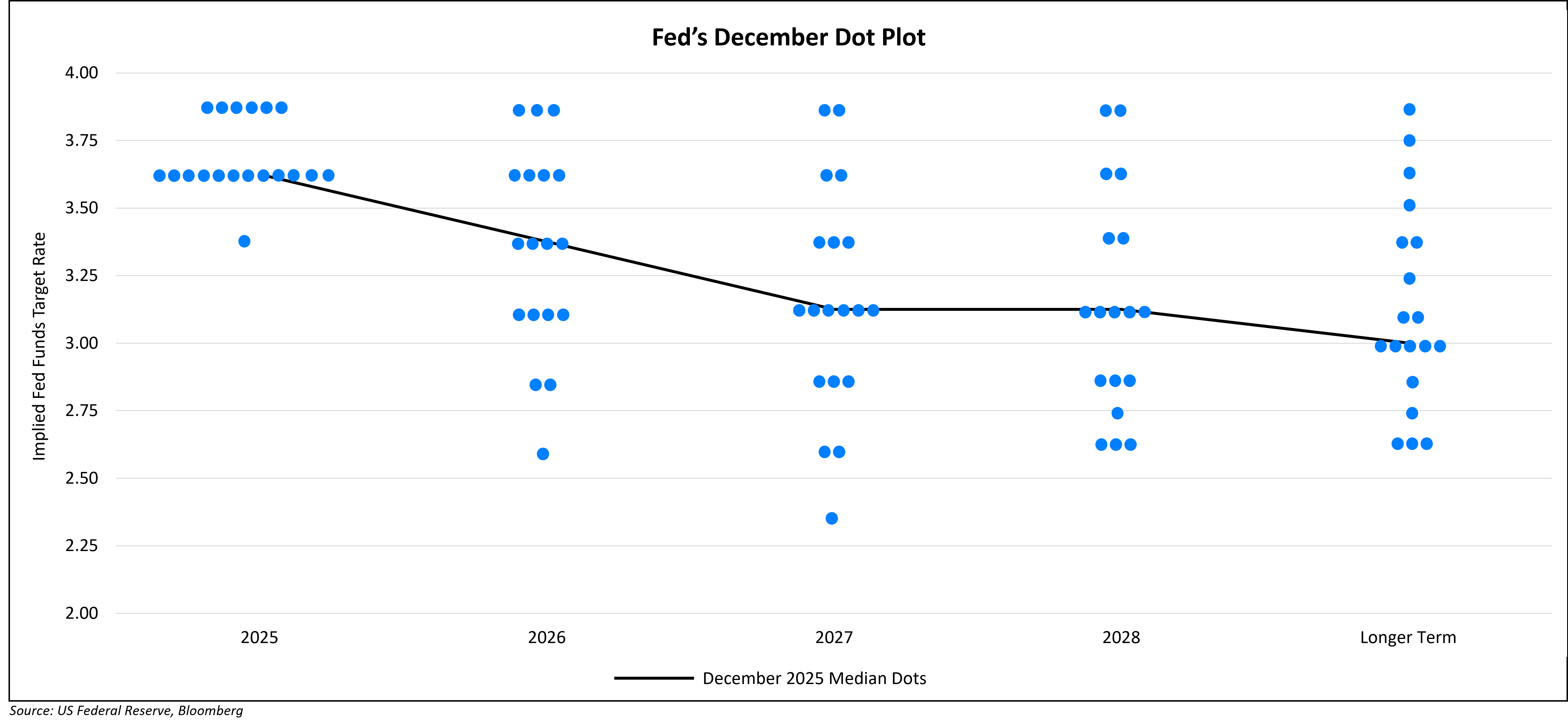 US Treasury yields fell across the curve – the 2Y yield fell by 7bp while the 10Y was down 4bp. The FOMC cut interest rates by 25bp as expected, with the Fed Funds Range now at 3.50-3.75%. The voting pattern saw 3 dissenters – Austan Goolsbee and Jeffrey Schmid preferred no change while Stephen Miran preferred a 50bp cut. The median dot plot over the next three years and the long-term was unchanged from September. As per the dot plot (above), the Fed is only penciling-in one rate cut in 2026. However, markets are still expecting two rate cuts by the Fed next year.