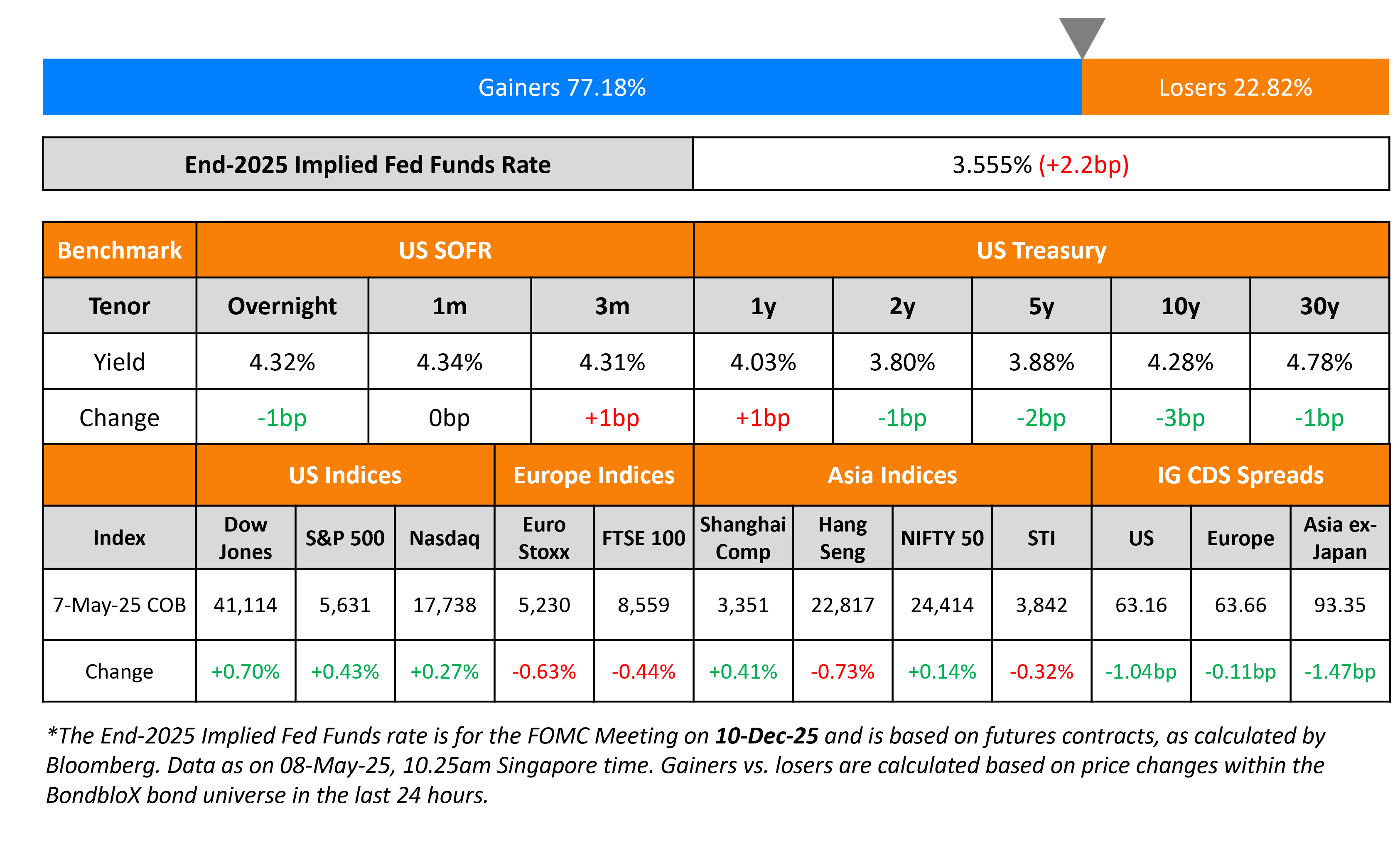 US Treasury yields eased marginally across the curve. The FOMC unanimously voted to keep rates unchanged as expected, with Fed Chairman Jerome Powell noting that they were “in a good position to wait and see” how the US tariff policy related uncertainty plays out.