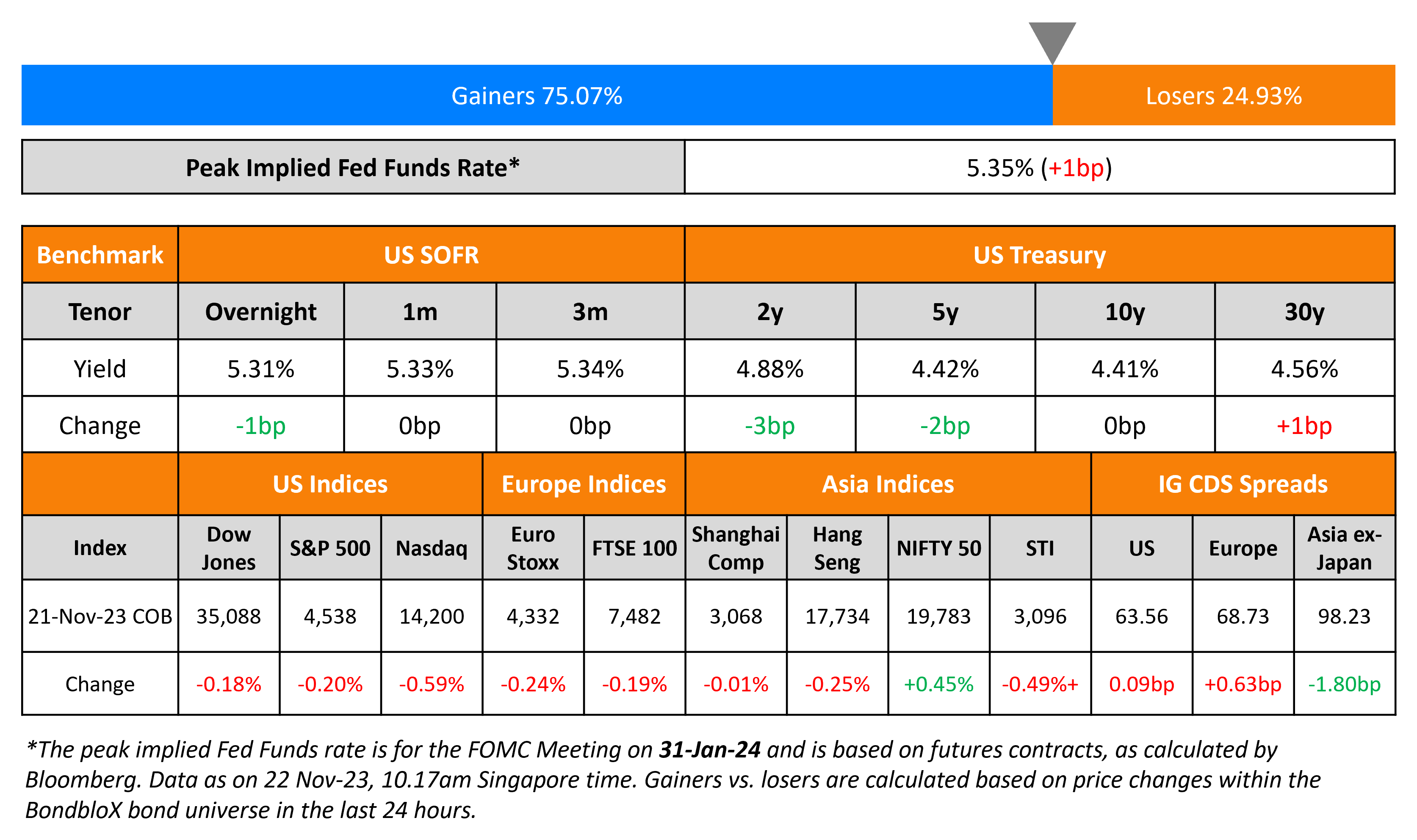 US Treasury yields were steady across the curve on Tuesday. The Federal Reserve’s minutes released yesterday showed that policymakers agreed on a stance to “proceed carefully” on future interest-rate moves and base any further tightening on progress toward their inflation goal. The auction of US 10Y Treasury inflation-protected securities (TIPS) was weak, with analysts noting that it may signal a possible deceleration in inflation. The bid-to-cover was at 2.38x, lower than the previous 2.44x and tailed by 3.5bp. The Peak Fed Funds Rate was higher again by 1bp. US credit markets saw IG CDS spreads widen 0.1bp and HY spreads tighten by 0.5bp. S&P and Nasdaq fell by 0.2% and 0.6% respectively.