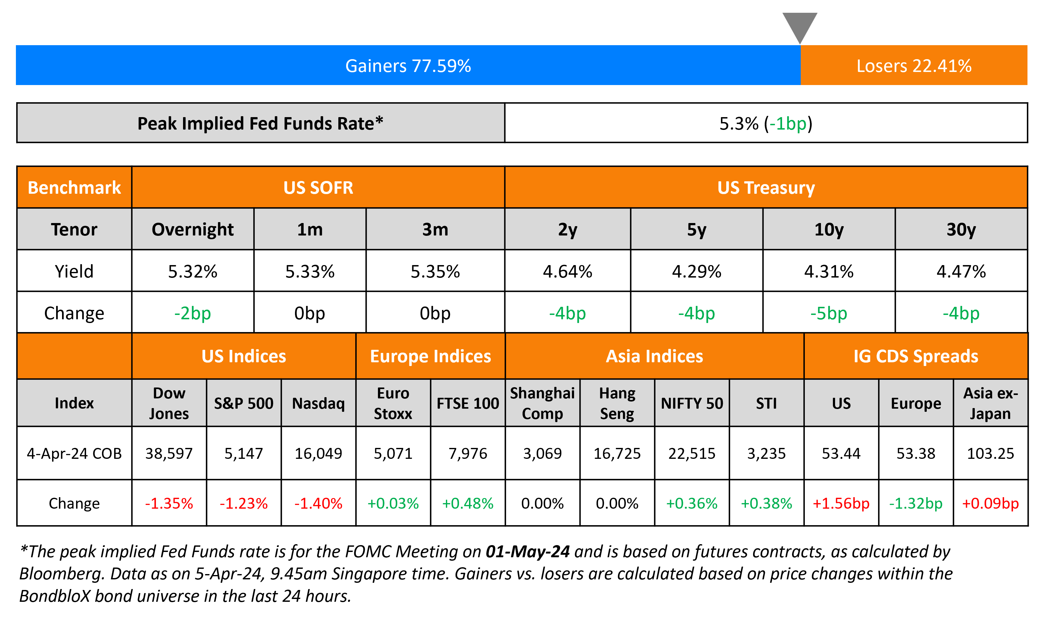 US Treasury yields moved lower by 4-5bp across the curve on Thursday amid risk-off sentiment in markets. US IG CDS spreads widened 1.6bp and the HY spreads widened 8bp with the S&P and Nasdaq closing 1.2-1.4% lower. This came as Brent crude crossed the $90/bbl mark amid tensions in the Middle East over the course of the week after an Israeli strike on an Iranian diplomatic compound in Syria. Oil prices have jumped over 6% this week and are up nearly 20% YTD.
