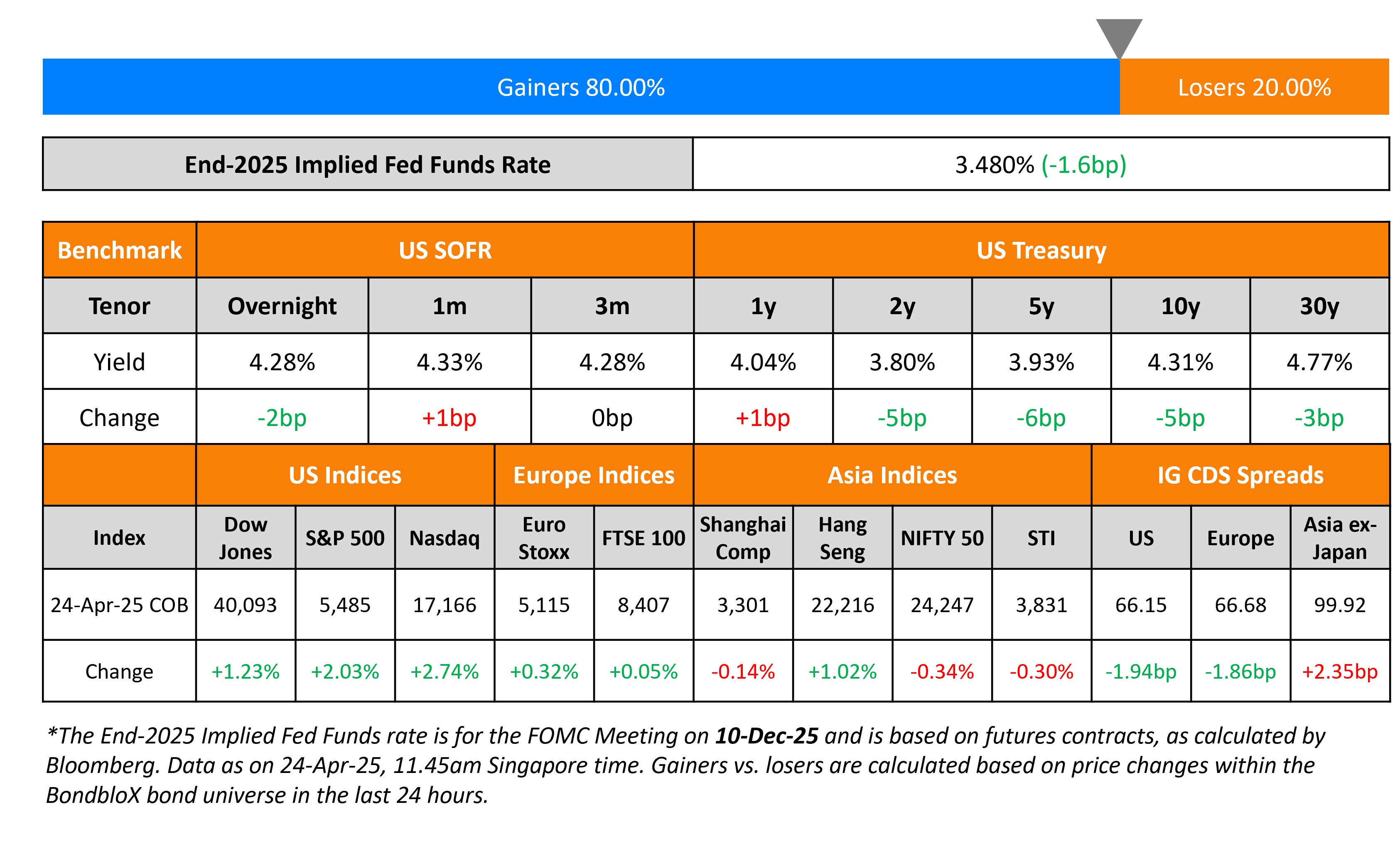 US Treasury yields fell across the curve by 5-6bp after Cleveland Fed President Beth Hammack kept the option open for a potential June rate cute. She noted that the Fed could take the action in June if there is “clear and convincing data” assisting policymakers in knowing the right move. Separately, preliminary Durable Goods Orders for March in the US rose sharply by 9.2% vs. expectations of 2%, due to a one-off spike in transportation orders led by aircraft bookings. For instance, Boeing said that it had received 192 aircraft orders in March, significantly higher than the 13 orders seen in February. Core Durable Goods Orders (ex-transportation) came-in at 0%, softer than expectations of 0.3%.