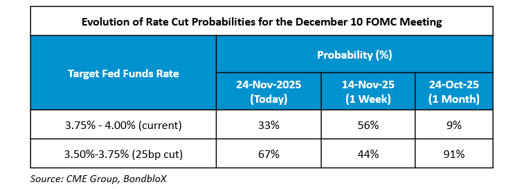 New York Fed President John Williams’ dovish comments has seen markets now pricing-in a 67% chance of a 25bp rate cut in December vs. 44% a week ago. He said that there was room to lower rates again in the near-term as the labor market softens, in his view. The above table shows the evolution of the probabilities of a December rate cut over the last month.
