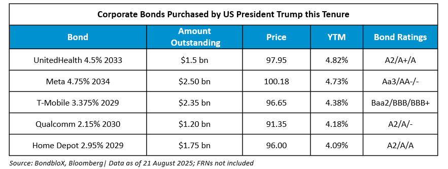 US President Donald Trump disclosed nearly $104mn in bond purchases since returning to office, according to a White House filing. The purchases include sizable investments in both municipal and corporate debt, primarily the former. Among the corporate bonds, he bought at least $500,000 each in bonds from Qualcomm, Home Depot, and T-Mobile, as well as at least $250,000 from Meta – all companies directly or indirectly impacted by policies on tariffs, technology, and supply chains. Besides, there are FRNs of Citi, Morgan Stanley and Wells Fargo. The report shows only broad ranges of amounts, not exact figures, and notes that Trump reported no sales. Unlike predecessors, Trump chose not to divest or place assets in a blind trust.