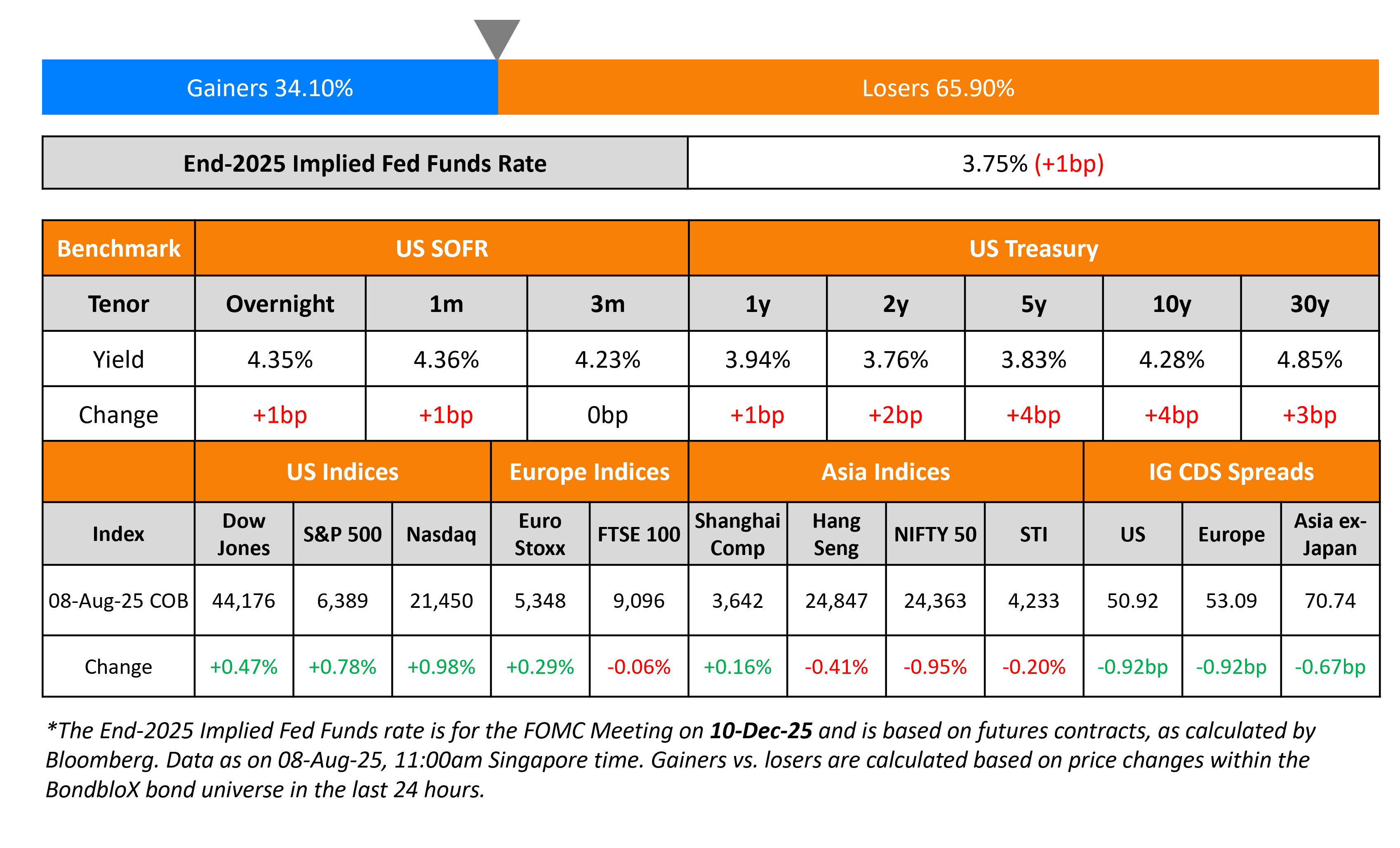 US Treasury yields were marginally higher led by the far-end of the curve, with the 10Y up by 4bp. While there were no major data points on Friday, markets now await Tuesday’s US CPI data. Fed Governor Michelle Bowman made a case for three rate cuts by year end, citing that a delay could see conditions deteriorate in the labor market and the overall US economy. Separately, Donald Trump and Vladimir Putin are set to meet in Alaska on Friday to discuss a potential ceasefire in Ukraine. Ukraine’s dollar bonds have been trending higher on the back of this update.