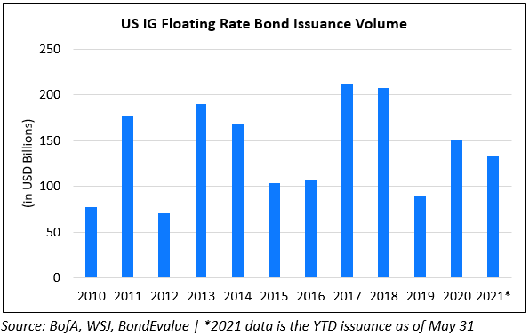 US IG floating rate bonds aka floaters/FRNs (Term of the day, explained below) have made a strong comeback with US IG issuance this year at $134bn, according to BofA, close to annual issuance volume for 2020 and matching the average annual issuance of $135bn since 2008. Non-financial corporates like Verizon and 7-Eleven have sold over $18bn in floaters according to Dealogic, 4x the amount issued in the same period last year. WSJ notes that the prospect of rising interest rates and inflation have made floaters more attractive as coupons re-adjust at regular intervals. “The last time floating-rate bond issuance picked up this much was before the 2008 financial crisis…It obviously has to do with investors’ concerns about interest rates rising. When you buy floating-rate debt and rates go up, you can still have some positive returns”, said Hans Mikkelsen, credit strategist at BofA. This is particularly important now after the FOMC’s recent hawkish policy meeting where the first rate hike projection was advanced to 2023 from 2024 earlier. Bloomberg-Barclays FRN index of bonds maturing in 5 years have returned 0.3% YTD vs. the -2% returns on the Bloomberg-Barclays IG index. Besides, WSJ notes that more than 60% of the FRN market have maturities between 1-3 years, suggesting some short-term protection for investors.