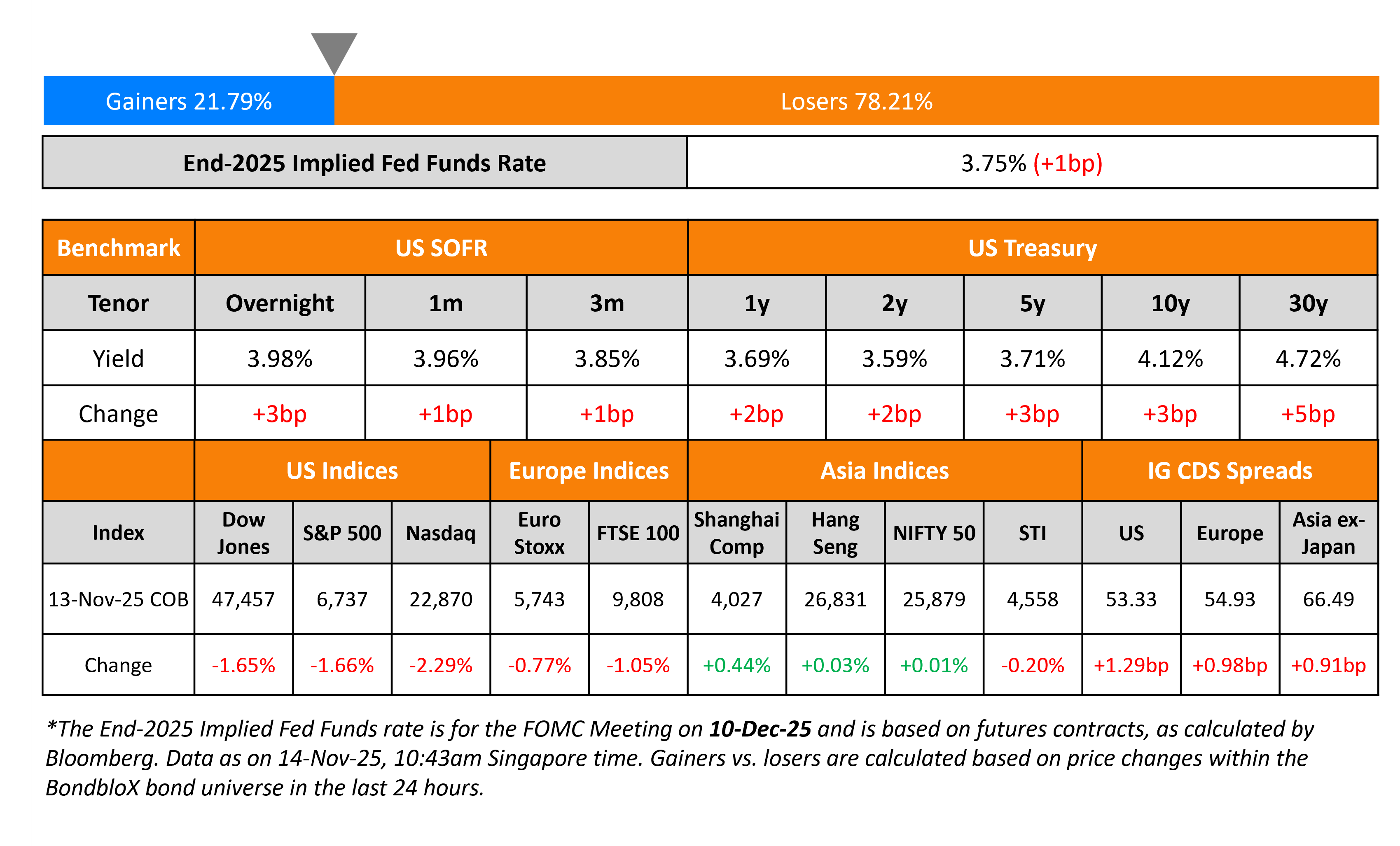 US Treasury yields were higher by ~3bp across the curve. After the October CPI data was not published yesterday, the US National Economic Council Director Kevin Hassett, noted that the unemployment rate for October may not be published at all. San Francisco Fed President Mary Daly said that it would be “premature” to decide on a December rate decision, noting that the direction of change in policy appeared “neutral”. The probability of the Fed cutting interest rates in December now stands at about 50% vs. over 65% earlier this week.