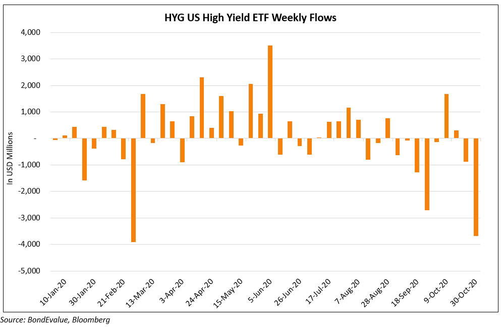 The iShares iBoxx Dollar High Yield ETF (HYG), which tracks high yield bonds, saw investors pull $3.67bn in the prior week, the largest outflow since February. With Covid cases increasing across US and Europe, increasing probabilities of renewed lockdowns and presidential elections this week, it appears that investors are raising cash on fears of widening spreads. Short interest on HYG, a rough indicator of bearish bets, is about 18% of shares outstanding according to Bloomberg and IHS Markit. “That’s some of what you were seeing, perhaps pre-election de-risking in combination with a little cloudier view of what the near-term pace of the economic recovery is going to look like”, said the chief investment strategist at asset manager Nuveen. Other high yield ETFs like the HYLB and JNK also saw similar moves – the former seeing the largest withdrawals on record and the latter facing its third straight week of outflows.