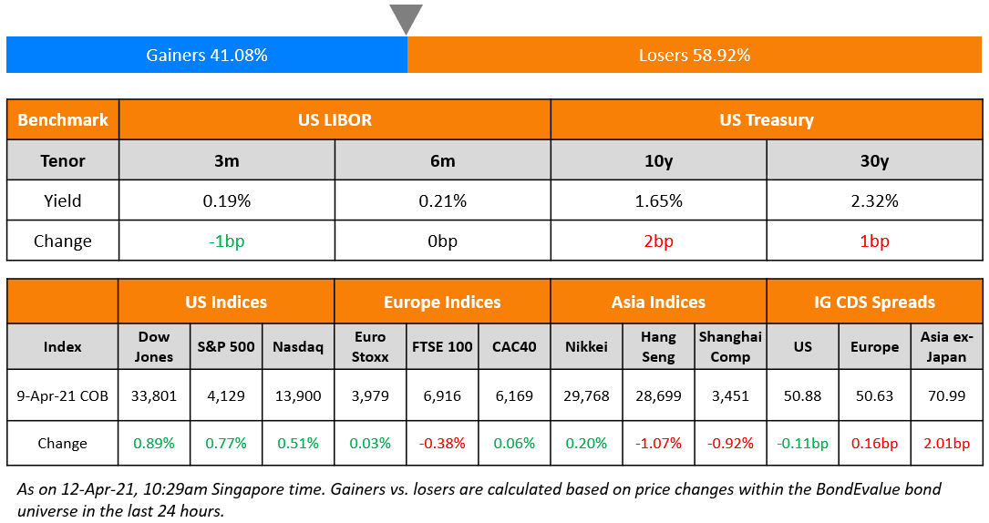 US primary market issuances rose to $31.5bn, up over 2x vs. $15bn the week prior. The rise in issuance can be attributed to both IG at $16.3bn and HY at $12.94bn vs. $6.4bn and $7.8bn respectively. The largest deals in the IG space were led by auto majors Toyota and GM raising $2.5bn and $2.25bn respectively via three-tranchers. In the HY space, Merck led the table, raising $4.1bn followed by Newscorp’s $1bn issuance. In North America, there were a total of 67 upgrades and 24 downgrades combined, across the three major rating agencies last week. LatAm saw $3.26bn in deals last week vs. $2bn in the week prior with Mexico as the only issuer raising $3.26bn via a 20Y bond offering. EU Corporate G3 issuance saw an increase of ~2x last week to $29bn from $15bn in the week prior – KfW raised $9.75bn via EUR and USD issuances followed by France’s CFF and BNP raising €1.5bn and €1.25bn. GCC and Sukuk G3 issuance was muted with minor deals worth $40mn vs. $2.6bn in the week prior. APAC ex-Japan G3 issuances dropped to $2.4bn vs. $9.8bn in the prior week. Issuances were led by UOB’s $1.5bn dual-trancher and Kores’ $500mn deals while Redco and Zhenro Properties’ raised $220mn each. In the Asia ex-Japan region, there were 10 upgrades and 9 downgrades combined, across the three major rating agencies last week.