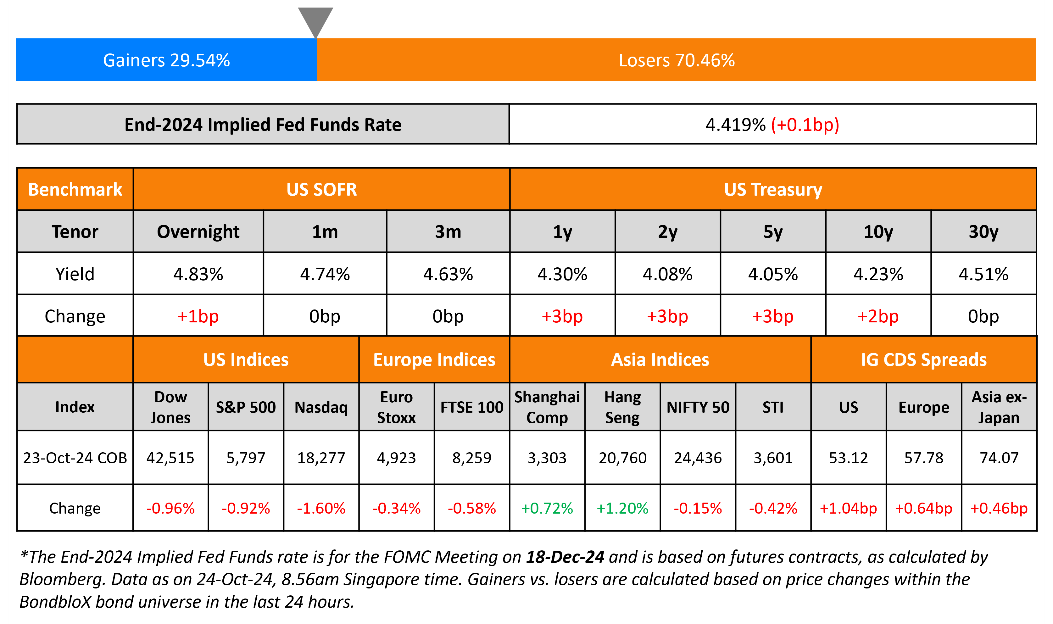 US Treasury yields extended their rise for a third straight day by 2-3bp across the curve. The Fed’s Beige Book was released yesterday and showed flat economic activity for most parts of the US in September. Analysts postulate that the US economy continues to slow despite upside shocks observed in the recently released inflation readings and unemployment rates. US IG and HY CDS saw a widening of 1bp and 5.1bp respectively. Looking at US equity markets, the S&P and Nasdaq closed lower by 0.9% and 1.6% respectively.
