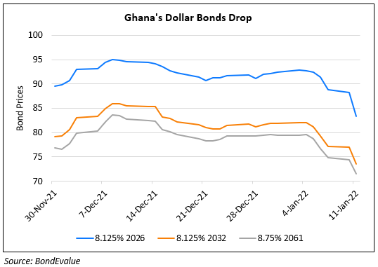 Dollar bonds of Ghana fell sharply yesterday. Goldman Sachs said that investors are concerned about burgeoning debt in high-yield developing nations including Ghana. Goldman’s analyst Sara Grut said, “Ghana mostly stands out for its fiscal risks, with the International Monetary Fund projecting that it will have one of the widest fiscal deficits of any EM high-yielder next year”.