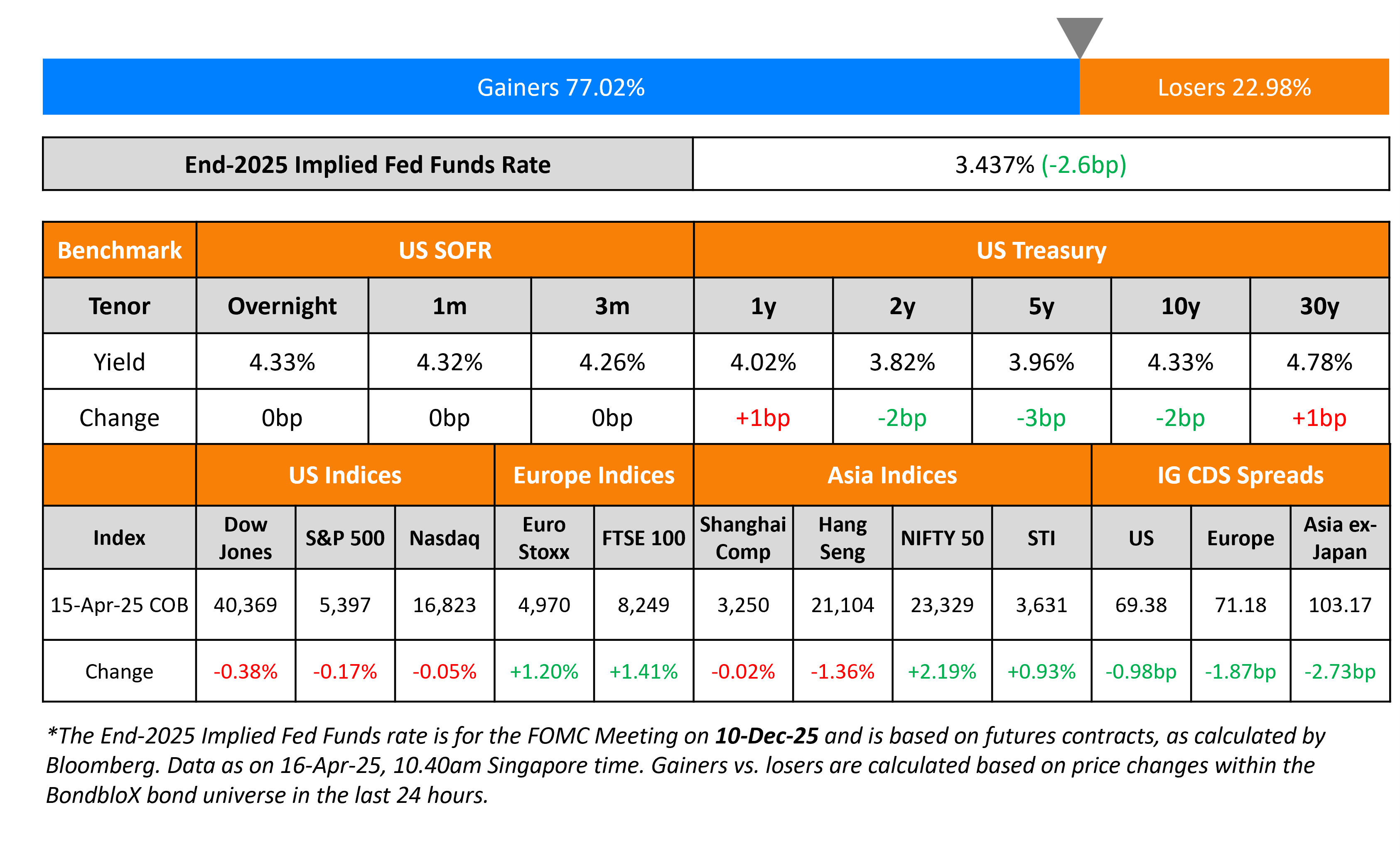 China Great Wall raised $450mn via a 3Y bond at a yield of 5.297%, 50bp inside initial guidance of T+195bp area. The senior guaranteed note is rated BBB- by Fitch. Proceeds will be used to replace offshore debt due in April 2025.