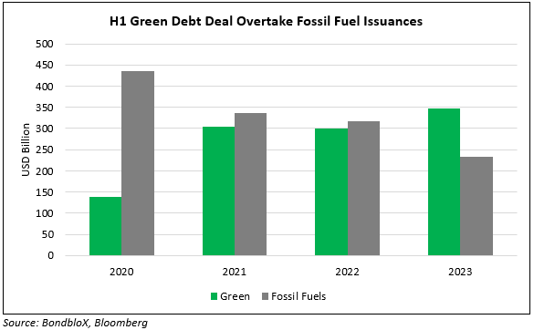 Issuance volumes of green bonds and loans by corporates and governments have gone past non-green fossil fuel issuances. In 1H 2023, green debt issuances stood at $347.6bn was vs. $233.3bn fossil fuel related financing as per Bloomberg. The compares to $300.1bn in green issuance vs. $316.5bn in fossil fuels during 1H 2022. Most issuances were from financial institutions, governments and some utility companies whilst there were only a few renewables companies, as per April Merleaux, research manager Rainforest Action Network. Bloomberg notes that these fossil fuel companies have seen solid cashflows thanks to the rise in oil prices following the Russia-Ukraine war and thus now have no particular requirement to raise large financing via non-green issuances.