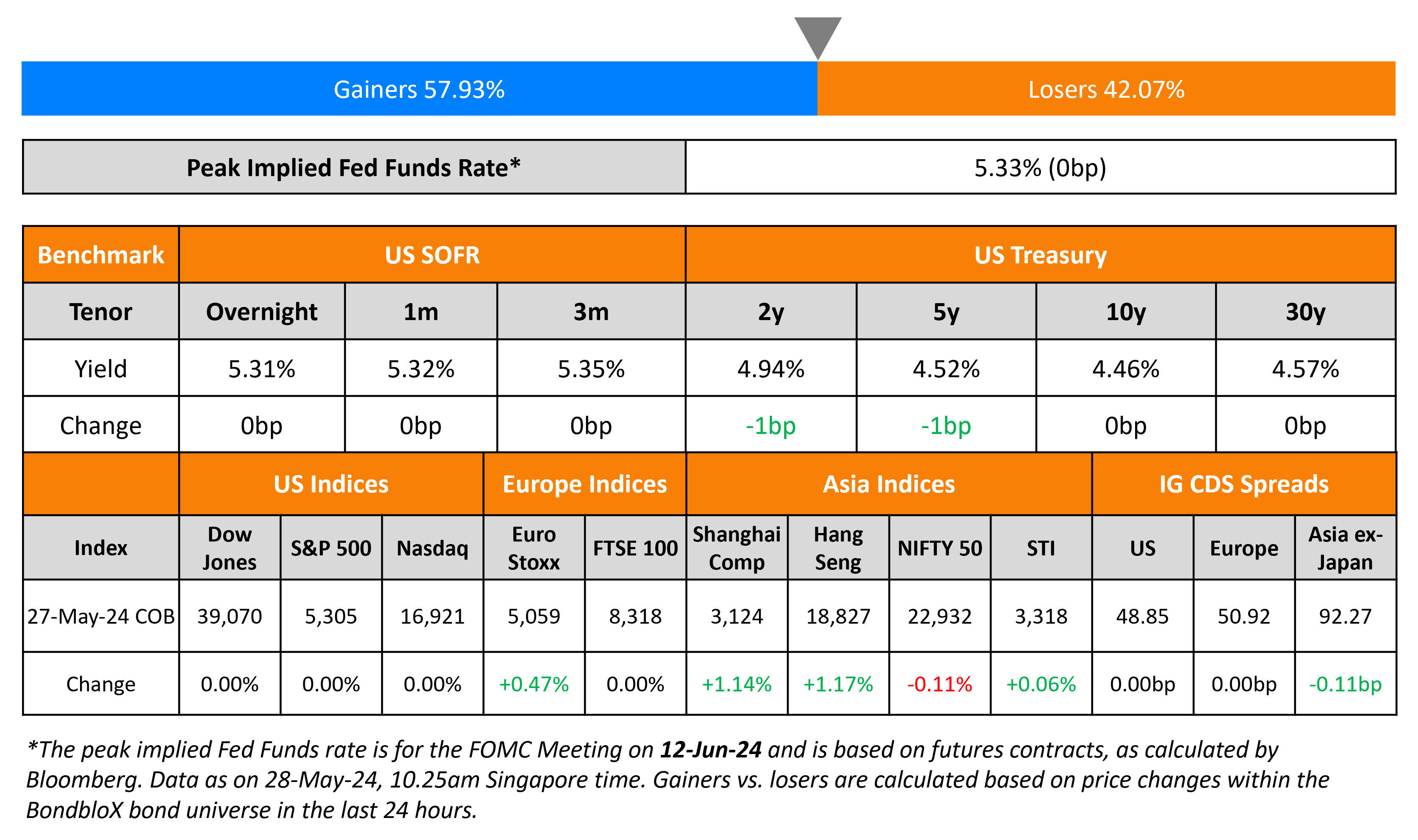 US Treasury yields were almost unchanged as US markets were closed on account of Memorial Day. Similarly, London was also closed due to the spring bank holiday, with European CDS markets also staying shut.