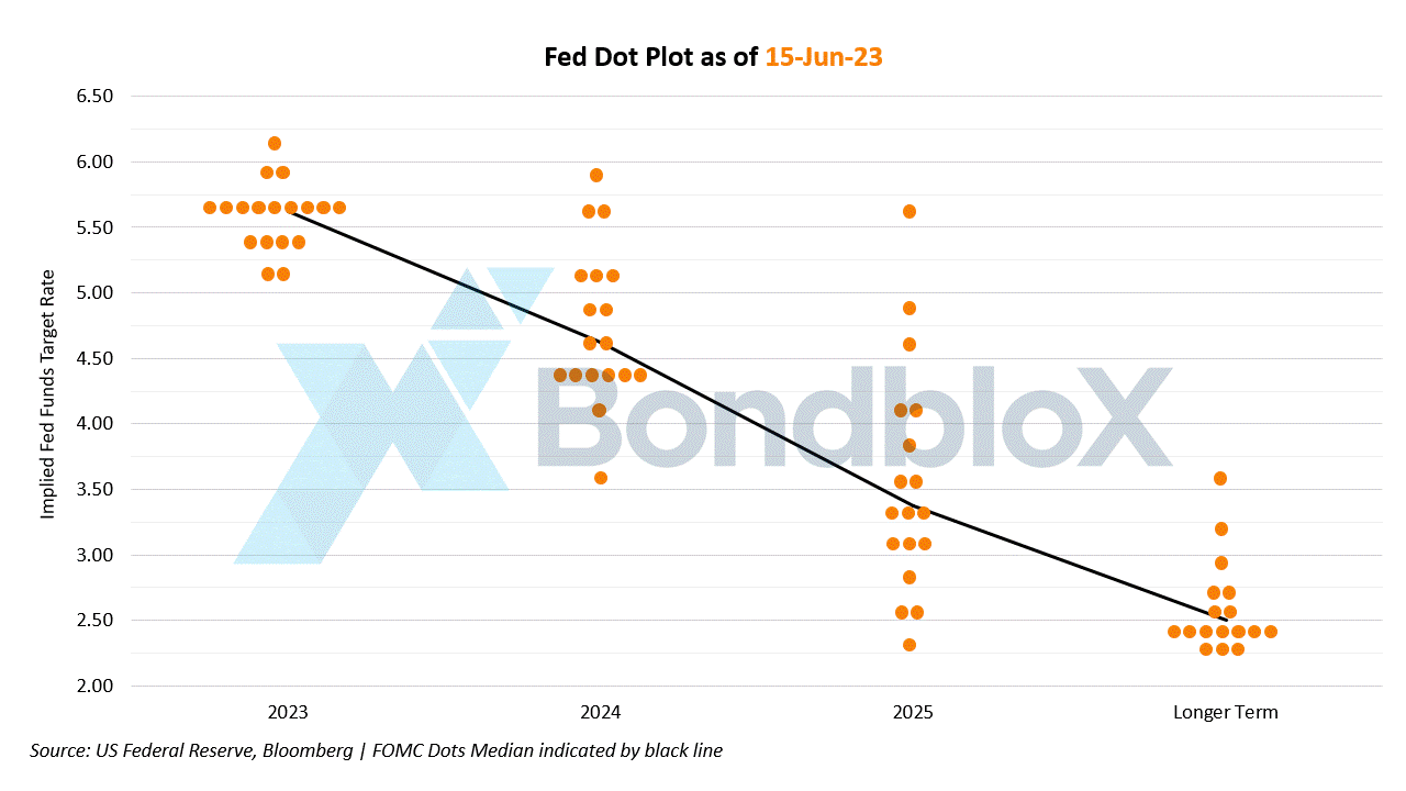US 2Y Treasury yields inched 6bp higher after the hawkish FOMC meeting where they kept the policy fed funds range on hold as expected, at 500-525bp. The median dots in the FOMC’s dot plot (Term of the Day, explained below) indicate another 50bp in rate hikes by the Fed in the remainder of the year. This compares to the March meeting’s dot plots which showed that policy rates were expected to stay at current levels. With Jerome Powell noting that July would be a “live meeting” and the upward shift in the dot plot for 2023, market participants are now expecting the Fed to hike rates by 25bp in July with a 72% probability. However, market participants are expecting the fed funds range to stay unchanged after a 25bp hike in July vs. the Fed’s dots indicating the rate to be another 25bp higher. The peak Fed Funds Rate moved 2bp higher to 5.29% for September. Regarding inflation, Powell said that the conditions for seeing inflation come down were conditions “coming into place. But the process of that actually working on inflation is going to take some time”.