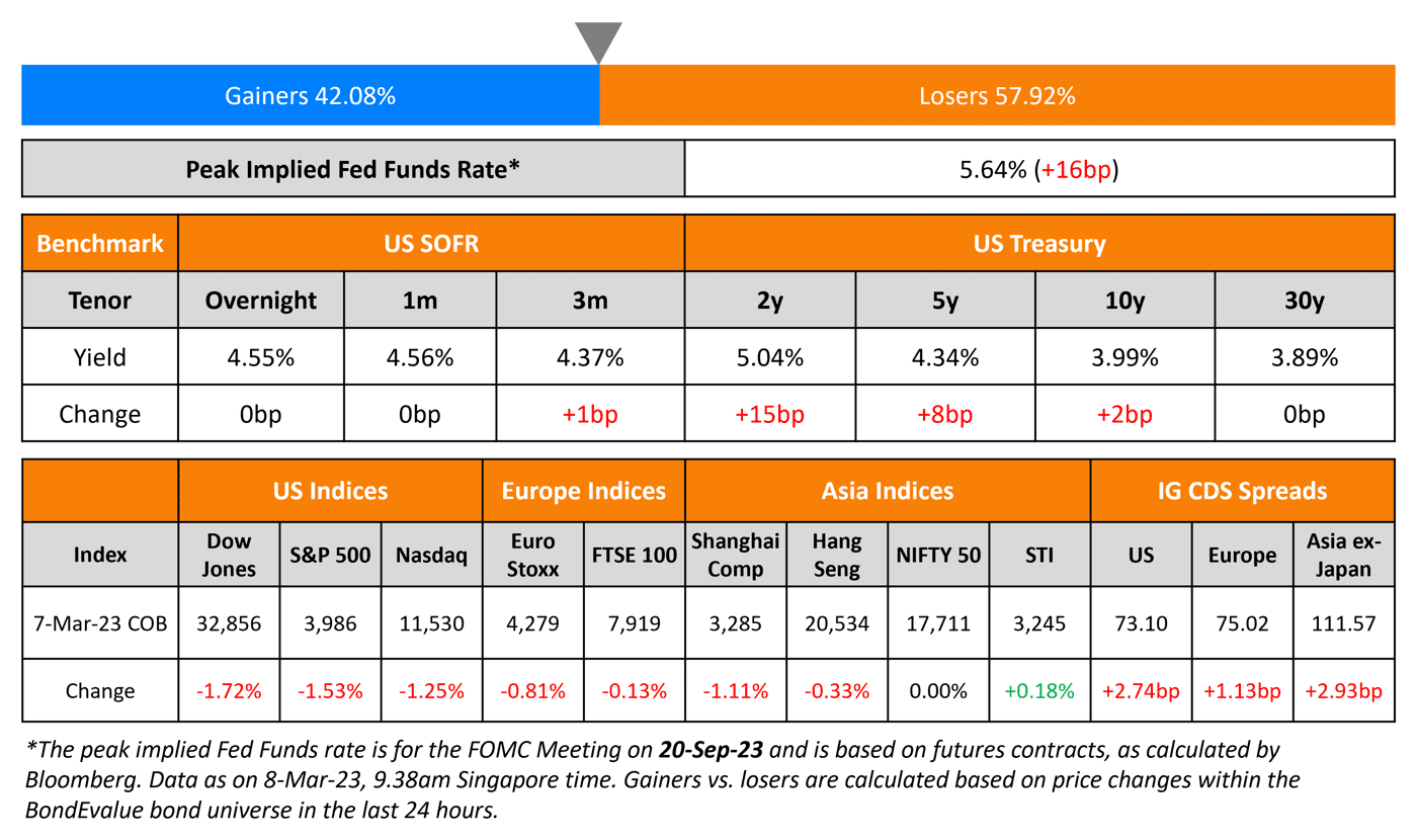 US 2Y Treasury yields shot higher by 15bp with the peak Fed Funds rate up 16bp to 5.64% for the September 2023 meeting. The US 2s10s Treasury curve has thus inverted to below -100bp, its lowest since 1981. US IG and HY CDS spreads widened by 2.7bp and 16.3bp respectively. The S&P and Nasdaq dropped after Powell’s comments, down by 1.5% and 1.3% respectively.