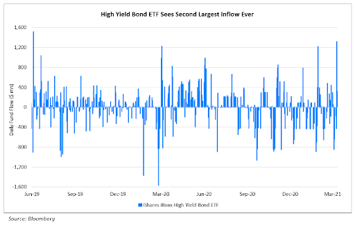 This comes amid rising Treasury yields, which makes junk bonds relatively more attractive than investment grade bonds given that the former typically have a shorter tenor and higher coupon, both leading to a lower duration. While HYG has a duration of 3.6 years, the largest investment grade bond ETF LQD has a duration of ~10 years. Peter Chatwell, head of multi-asset strategy at Mizuho International Plc said, “What we’ve had in bond markets for much of the year to date is a selloff in duration, which has meant that high yield, which is high spread and low duration, has been the safer asset class. These flows reflect that, and we expect there will be further moves in that direction as U.S. growth becomes more broad based and helps to support the rest of the world.”