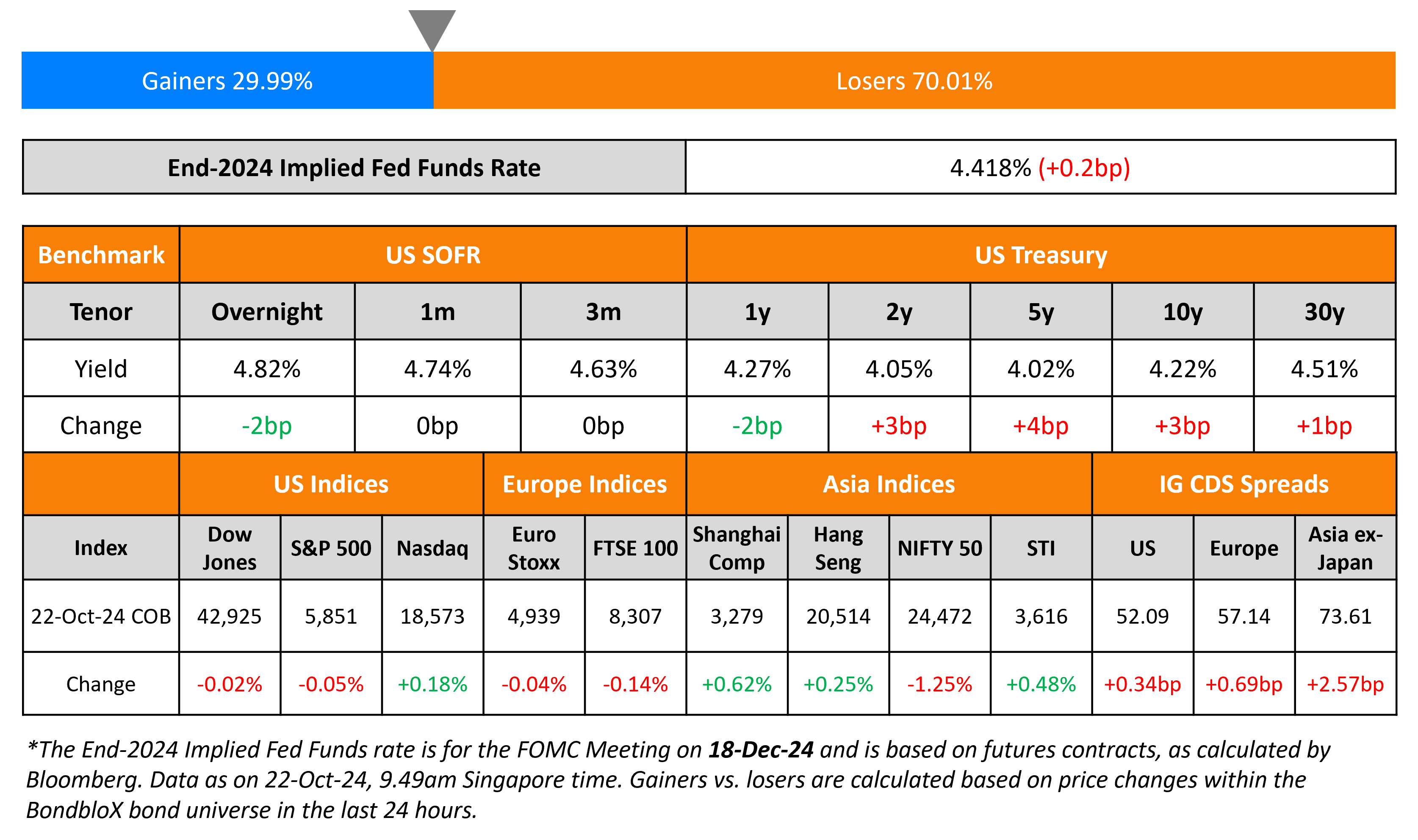 US Treasury yields ticked higher yesterday, by about 3-4bp across the curve. As per an analysis by Bloomberg, the rise in Treasury yields since the Fed’s 50bp rate cut in September draws parallels to the mid-1990s when the then Fed Chairman Greenspan managed to create a soft landing. For instance, the 2Y yield has risen 35bp since the rate cut in September with analysts noting that the move came on the back of investors pricing-in lower probabilities of an upcoming recession, and an improved likelihood of a soft landing. Markets are now pricing-in a slower pace of rate cuts of 128bp through September 2025, from 195bp about a month ago. With the US election nearing, some analysts note that investors are also hedging a potential Trump victory, that might imply lower tax rates and further spending, that would drive up the fiscal deficit. US IG and HY CDS saw a widening of 0.3bp and 2.2bp respectively. Looking at US equity markets, the S&P closed lower by 0.05% while the Nasdaq was up by 0.2%.