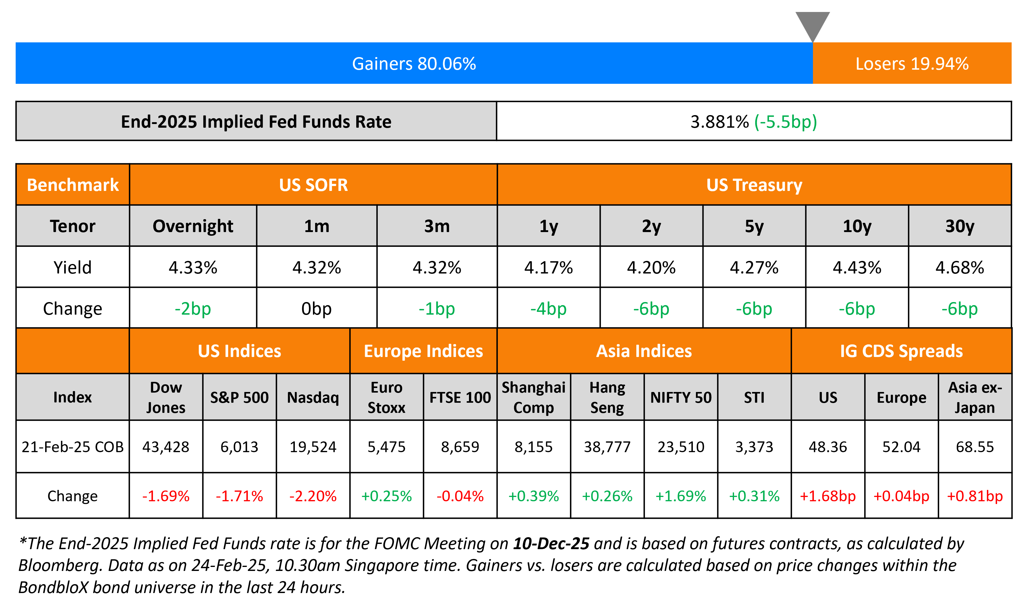 US equity markets saw the S&P and Nasdaq ending lower by 1.7% and 2.2% respectively. Looking at credit markets, US IG and HY CDS spreads were 1.7bp and 10.8bp wider respectively. European equity markets ended mixed. The iTraxx Main CDS spread was flat while the Crossover CDS spreads widened by 0.4bp. Asian equity markets have opened broadly mixed this morning. Asia ex-Japan CDS spreads were wider by 0.8bp.