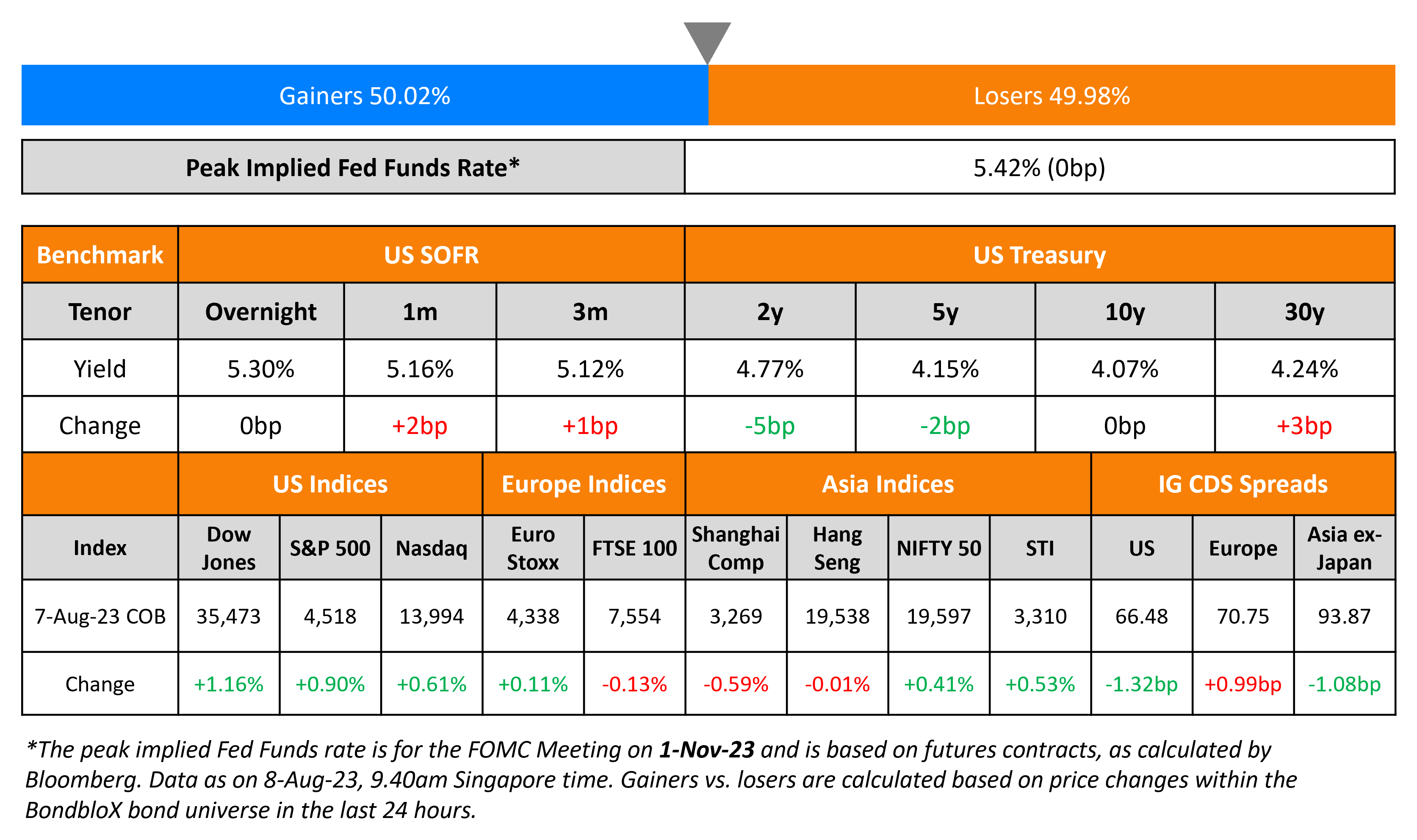 US 2Y Treasury yields were down 5bp while the rest of the curve held stable. Following the large selloff in US Treasuries last week, Goldman Sachs and JPMorgan have come out with calls to buy Treasuries. They believe that the sell-off especially in the 10Y and 30Y were overdone. Further, Goldman and Morgan Stanley are bullish on the 30Y inflation-linked bonds while JPMorgan is bullish on the 5Y note. US IG credit spreads were tighter by 1.3bp and HY CDS spreads tightened by 6.8bp. The S&P and Nasdaq were higher by 0.6-0.9%.